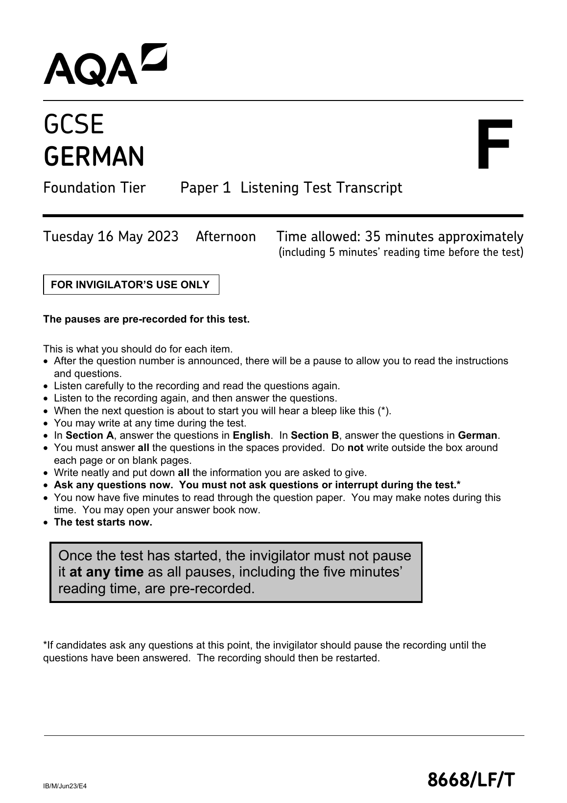 AQA GCSE GERMAN PAPER 1 QUESTION PAPER 2023 (8668/LF/T:  Listening Test Transcript - Foundation Tier). DOWNLOAD OFFICIAL AND VERIFIED AQA GCSE GERMAN PAPER 1 QU...