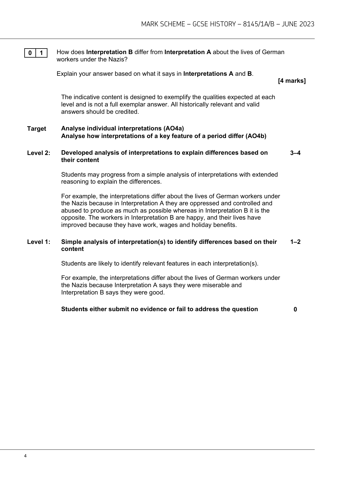 AQA GCSE HISTORY PAPER 1 MARK SCHEME 2023 (8145/1A/B: Germany, 1890–1945: Democracy and dictatorship).