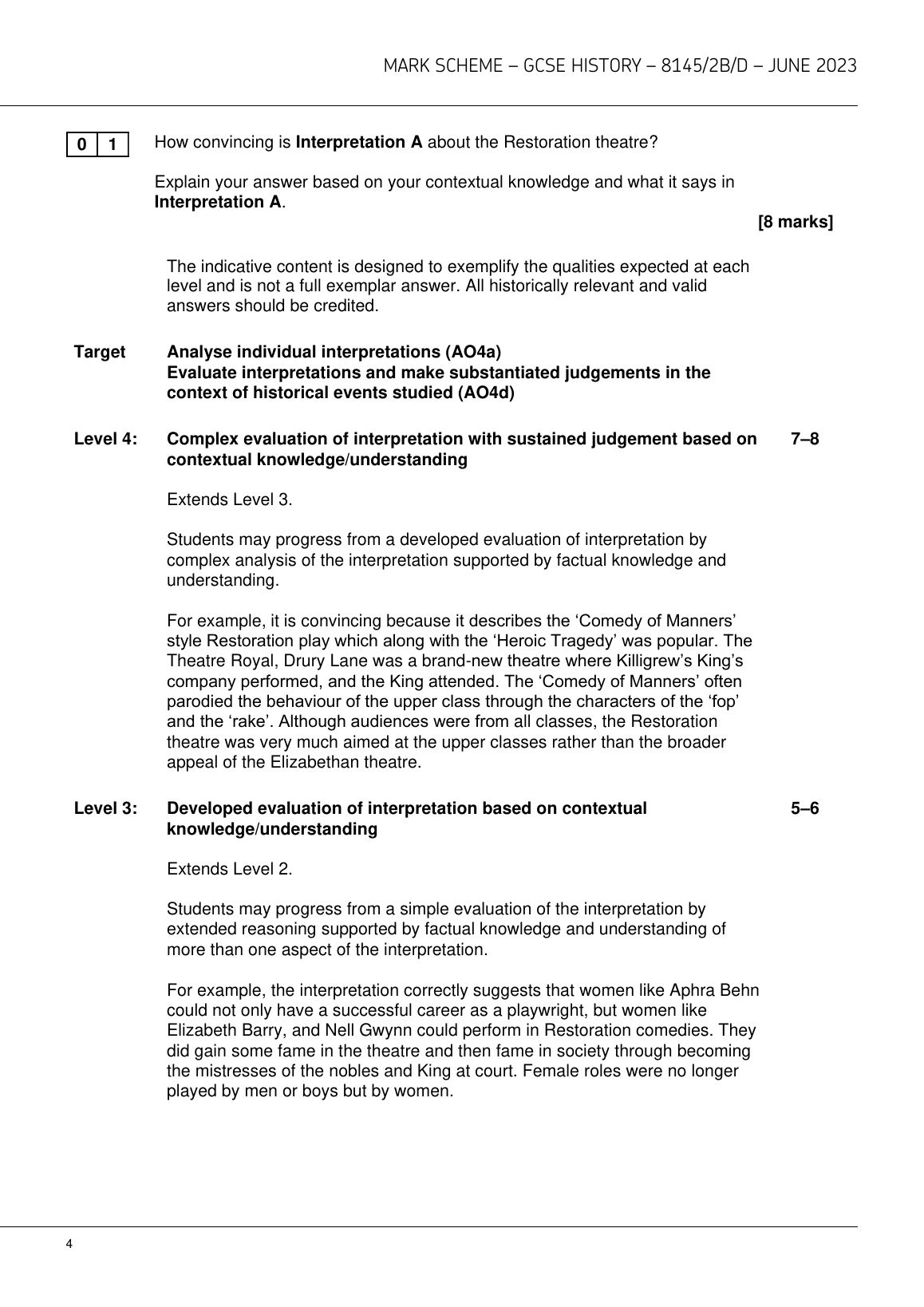 AQA GCSE HISTORY PAPER 2 MARK SCHEME 2023 (8145/2B/D: Restoration England, 1660–1685).