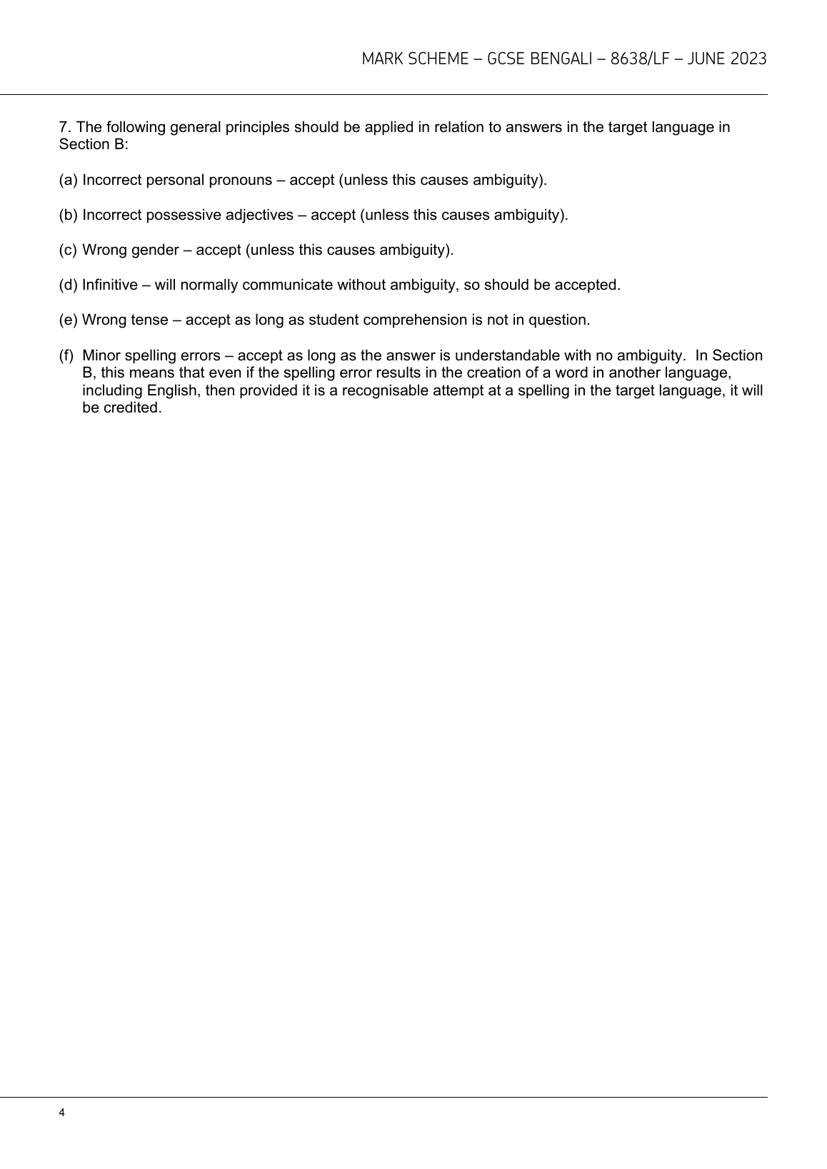 AQA GCSE BENGALI PAPER 1 MARK SCHEME 2023 (8638/LF: Listening Foundation)