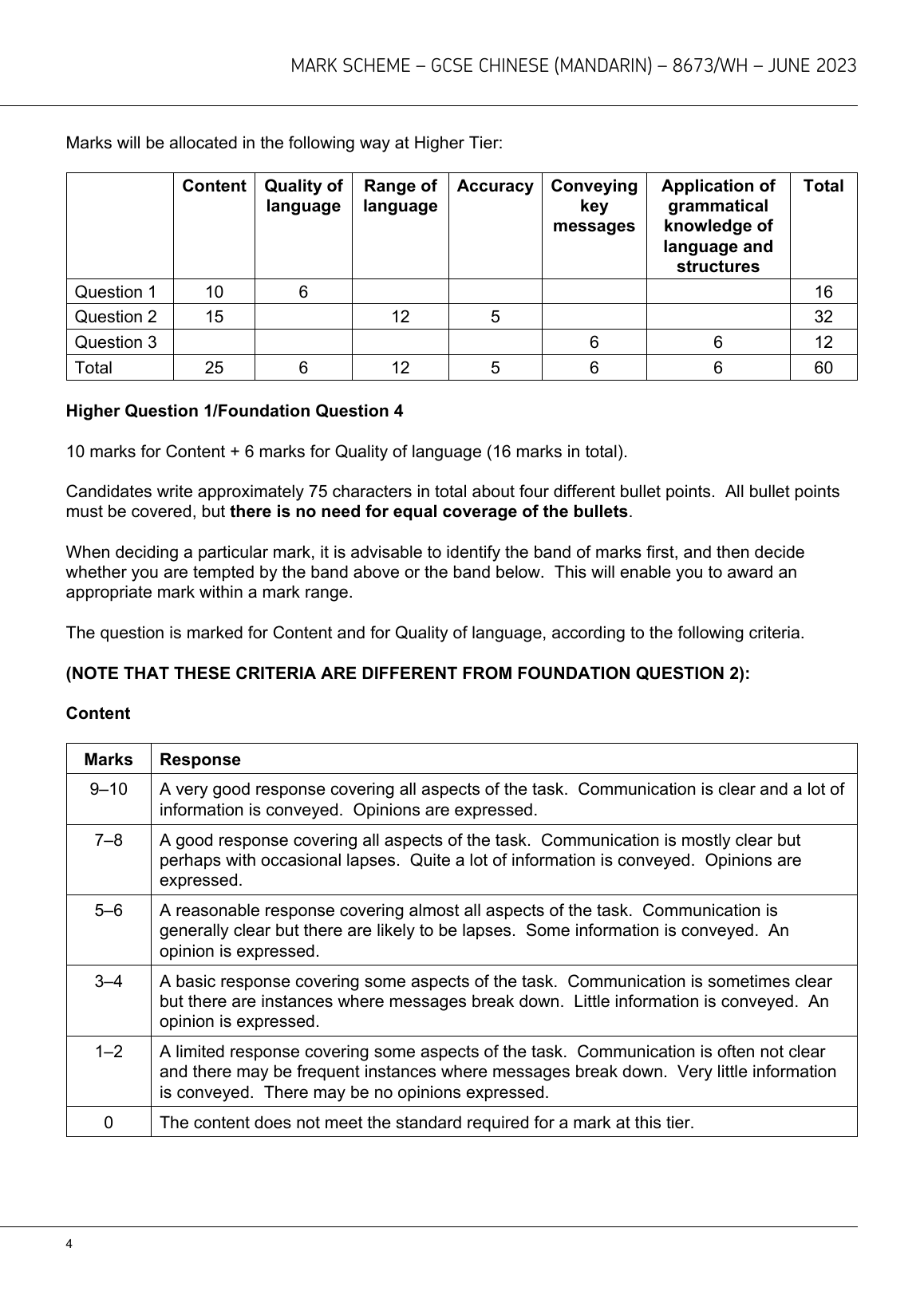 AQA GCSE CHINESE (MANDARIN) PAPER 4 MARK SCHEME 2023 (8673/WH: Writing Higher Tier)
