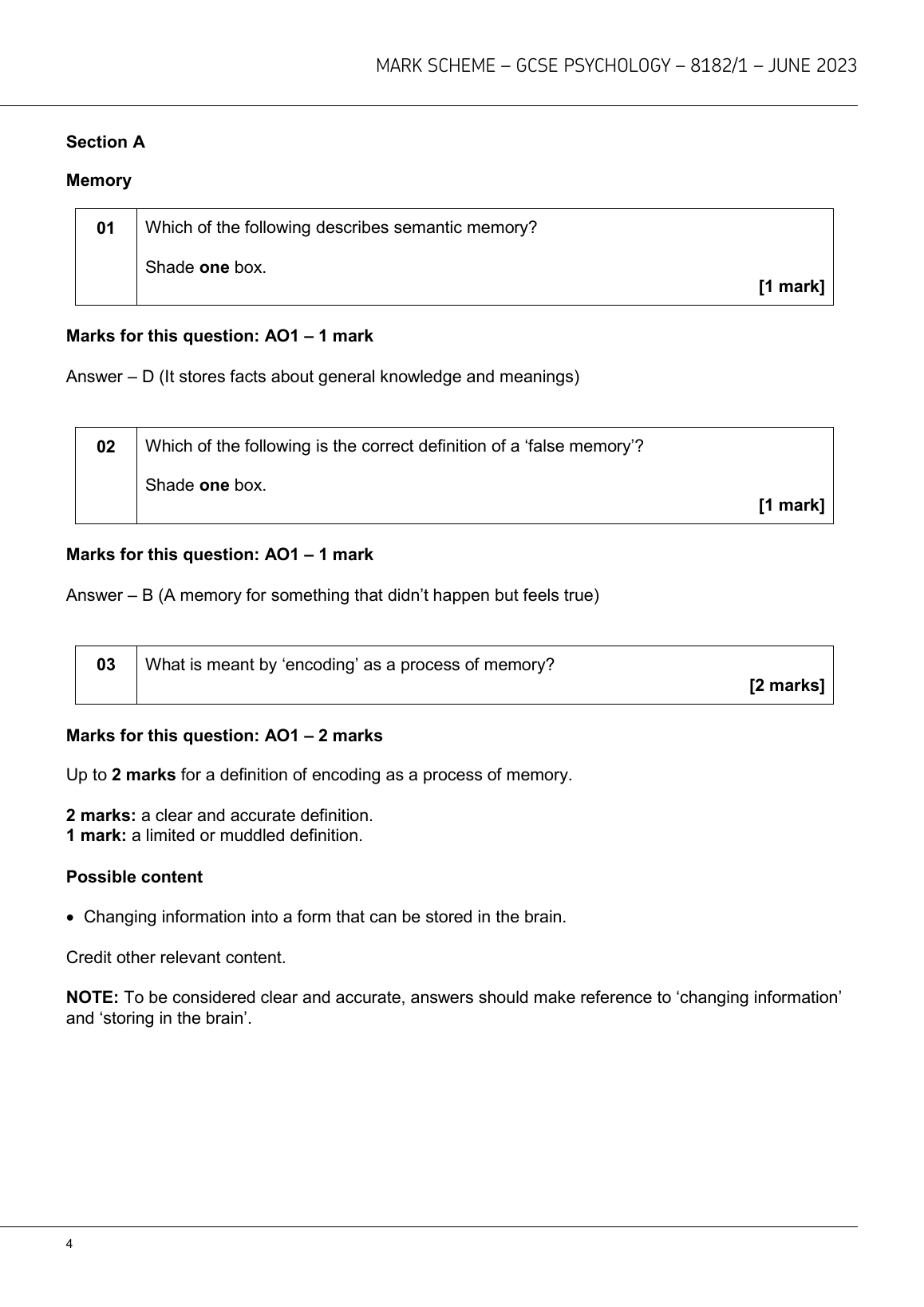 AQA GCSE PSYCHOLOGY PAPER 1 MARK SCHEME 2023 (8182/1: Cognition and Behaviour)