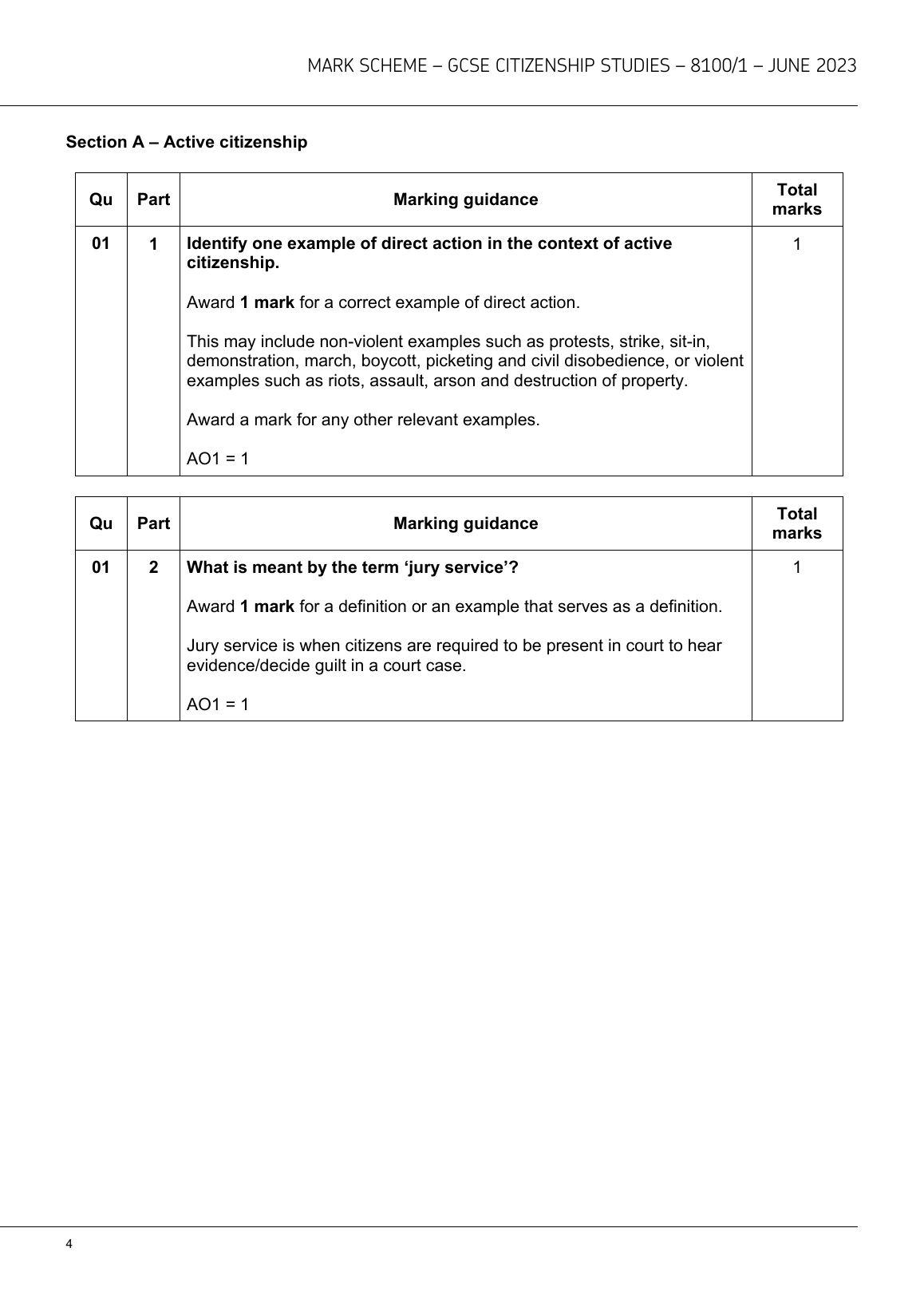 AQA GCSE CITIZENSHIP STUDIES PAPER 1 MARK SCHEME 2023 (8100/1)
