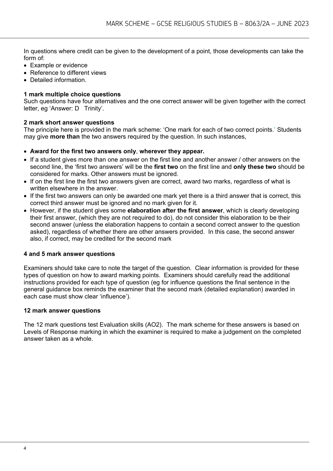AQA GCSE RELIGIOUS STUDIES B PAPER 2 MARK SCHEME 2023 (8063/2A: Perspectives on faith (themes))