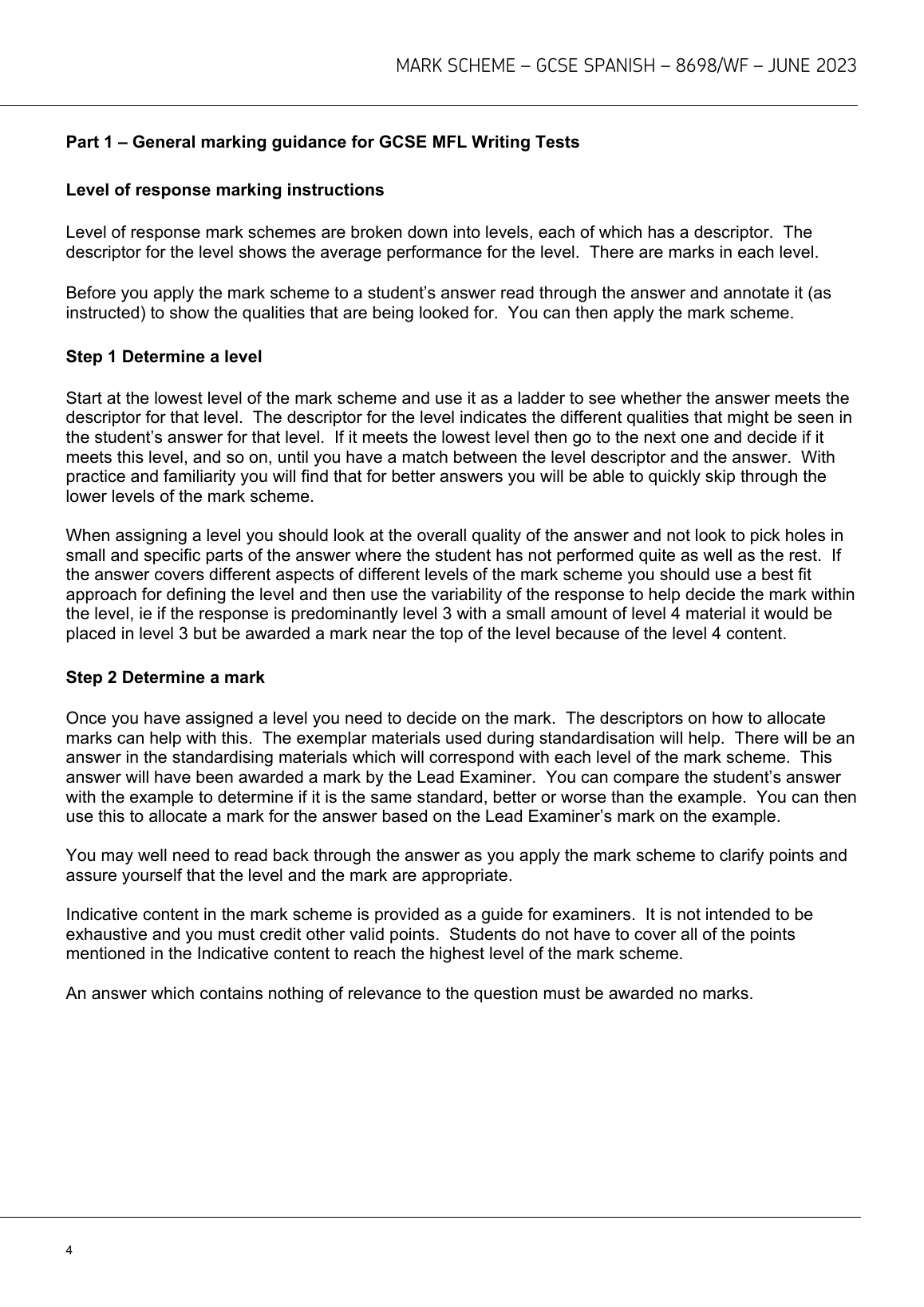 AQA GCSE SPANISH PAPER 4 MARK SCHEME 2023 (8698/WF: Writing - Foundation Tier). DOWNLOAD OFFICIAL AND VERIFIED AQA GCSE SPANISH PAPER 4 MARK SCHEME 2023 ON www.leakedexams.com.