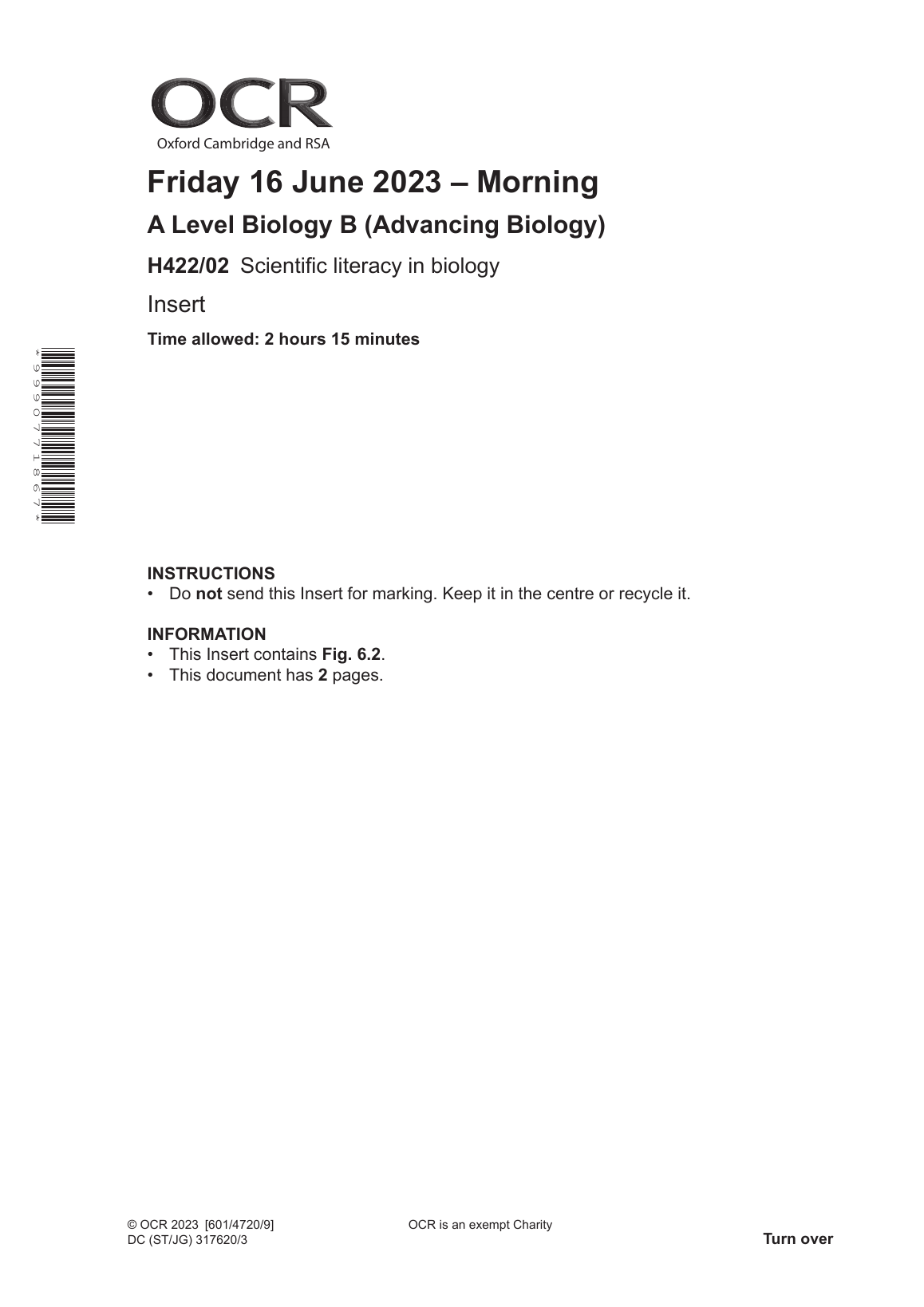 OCR GCE A LEVEL BIOLOGY B PAPER 2 INSERT 2023 (H422/02: Scientific literacy in biology)