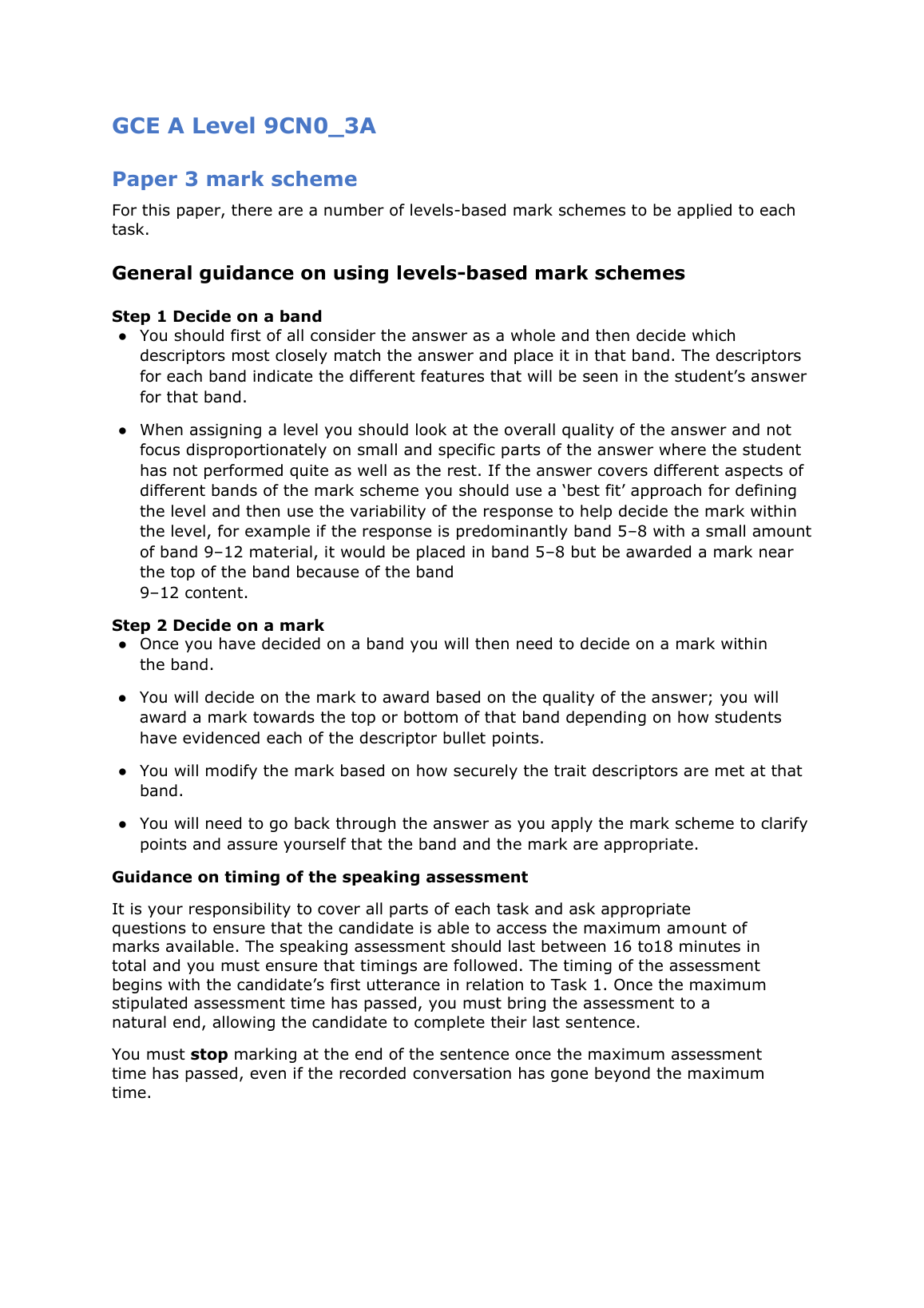 PEARSON EDEXCEL A LEVEL Chinese PAPER 3 2023 MARK SCHEME (9CN0/03: Speaking)
