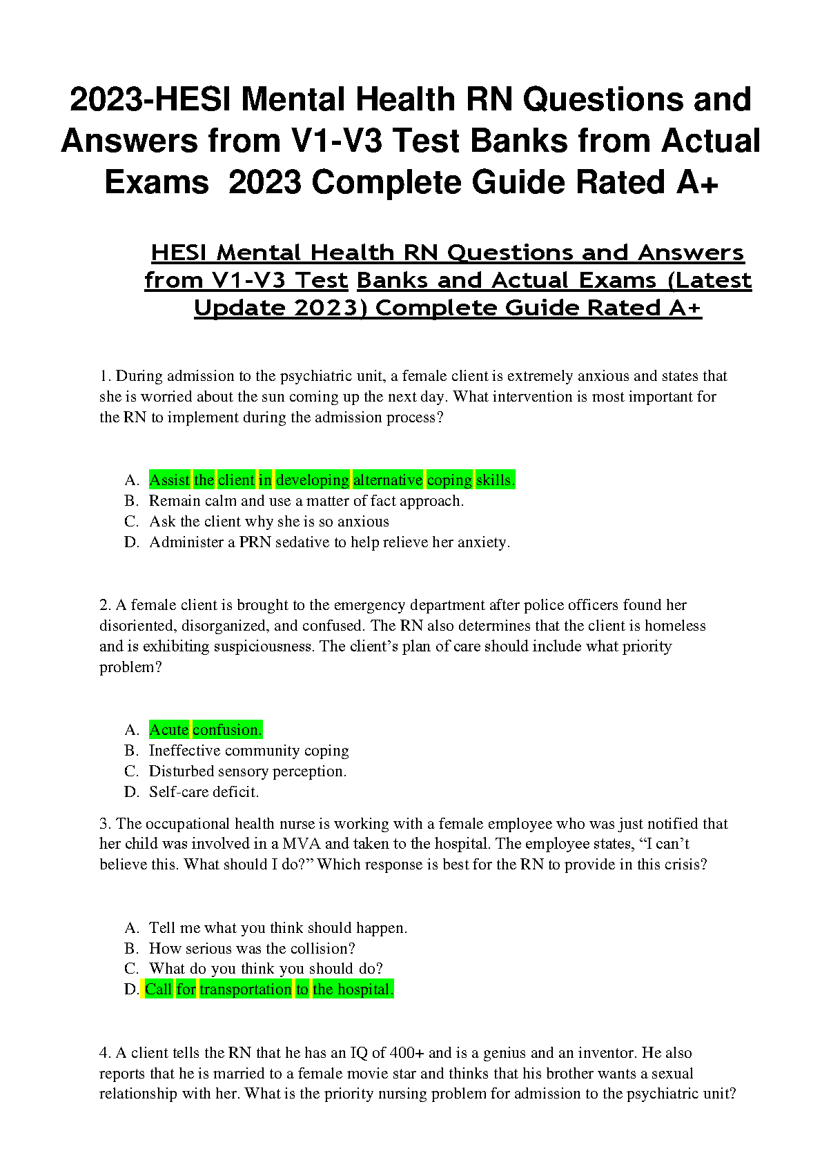 2024 HESI Mental Health RN Questions and Answers from V1-V3 Test Banks from Actual Exams Complete Guide Rated A+