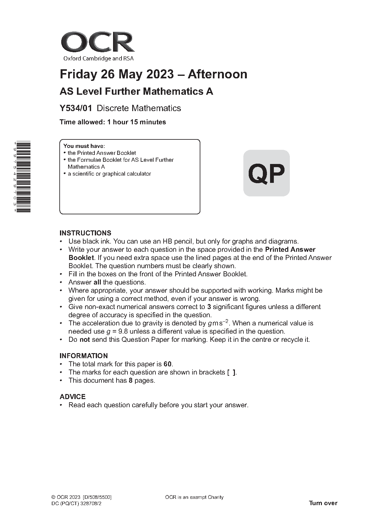 OCR GCE AS LEVEL FURTHER MATHEMATICS A PAPER 1 QUESTION PAPER 2023 (Y534/01: Discrete Mathematics). DOWNLOAD OFFICIAL AND VERIFIED OCR AS LEVEL FURTHER MATHEMATICS A PAPER 1 QUESTION PAPER 2023 ON www.leakedexams.com.