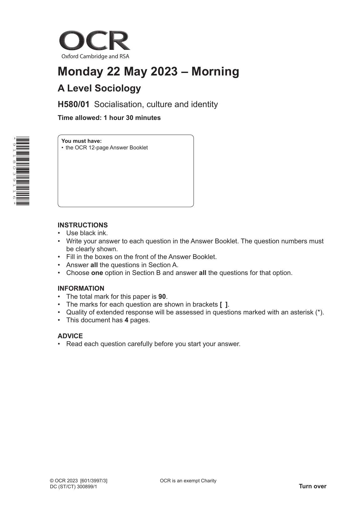 OCR GCE A LEVEL SOCIOLOGY PAPER 1 QUESTION PAPER 2023 (H580/01: Socialisation, culture and identity). DOWNLOAD OFFICIAL AND VERIFIED OCR A LEVEL SOCIOLOGY PAPER 1 QUESTION PAPER 2023 ON www.leakedexams.com.
