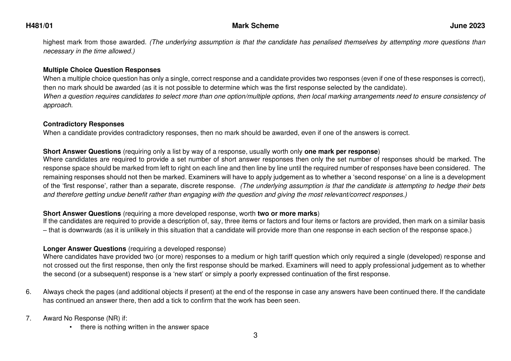 OCR GCE A LEVEL GEOGRAPHY PAPER 1 MARK SCHEME 2023 (H481/01: Physical systems)