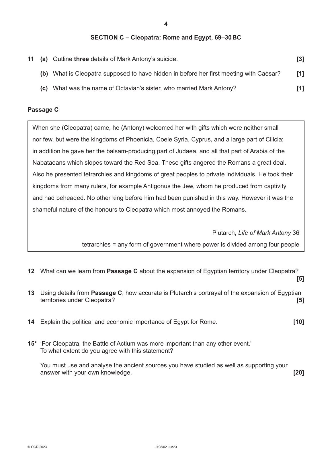 OCR GCSE ANCIENT HISTORY PAPER 2 QUESTION PAPER 2023 (J198/02: Rome and its neighbours)