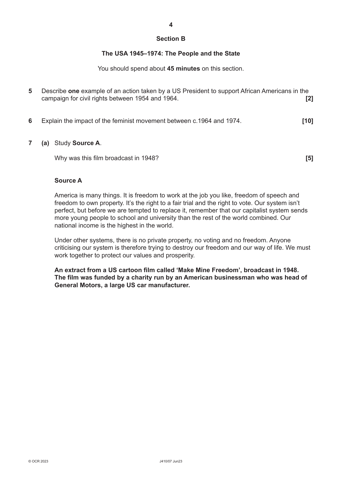 OCR GCSE HISTORY A PAPER 7 QUESTION PAPER 2023 (J410/07: The USA 1945-1974: The People and the State)