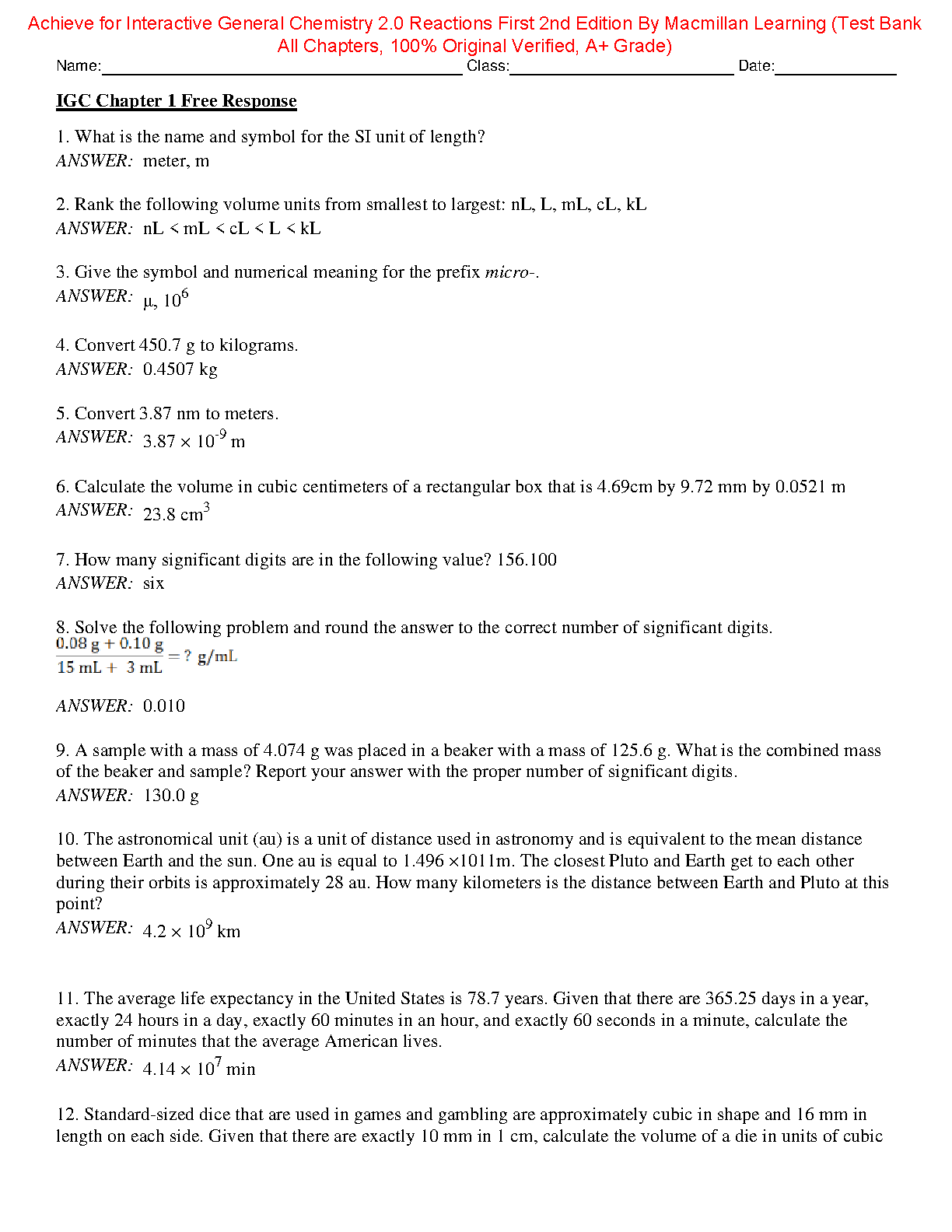 Test Bank for Achieve for Interactive General Chemistry 2.0 Reactions First 2nd Edition By Macmillan Learning