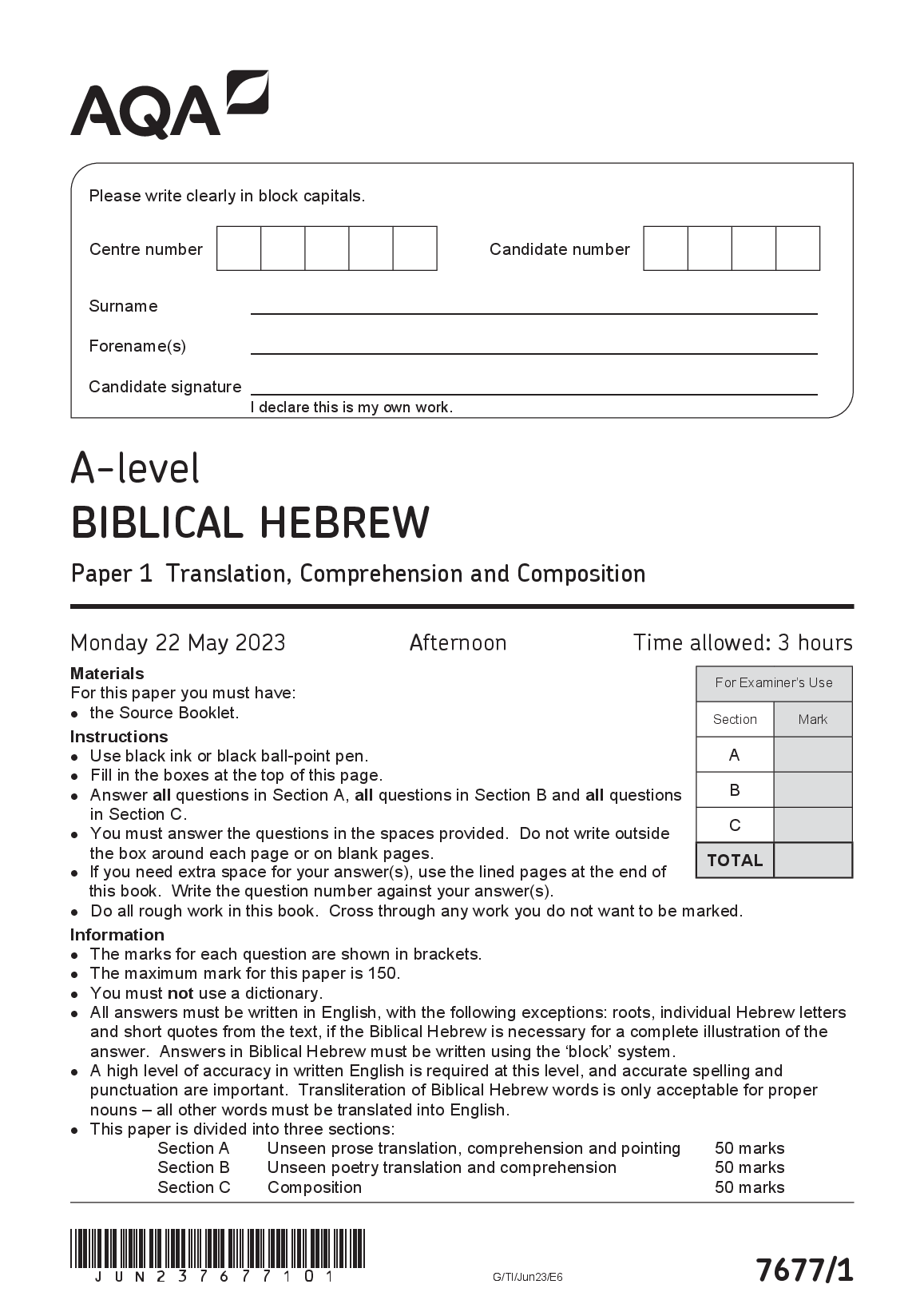 AQA A LEVEL BIBLICAL HEBREW PAPER 1 QUESTION PAPER 2023 (7677/1: Translation, Comprehension and Composition). DOWNLOAD OFFICIAL AND VERIFIED AQA A LEVEL BIBLICAL HEBREW PAPER 1 QUESTION PAPER 2023 ON www.leakedexams.com.