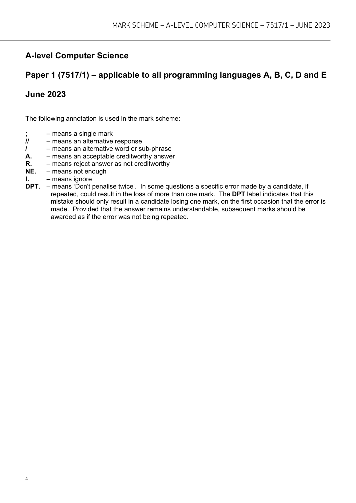 AQA A LEVEL COMPUTER SCIENCE MARK SCHEME PAPER 1 JUNE 2023 (7517/1)