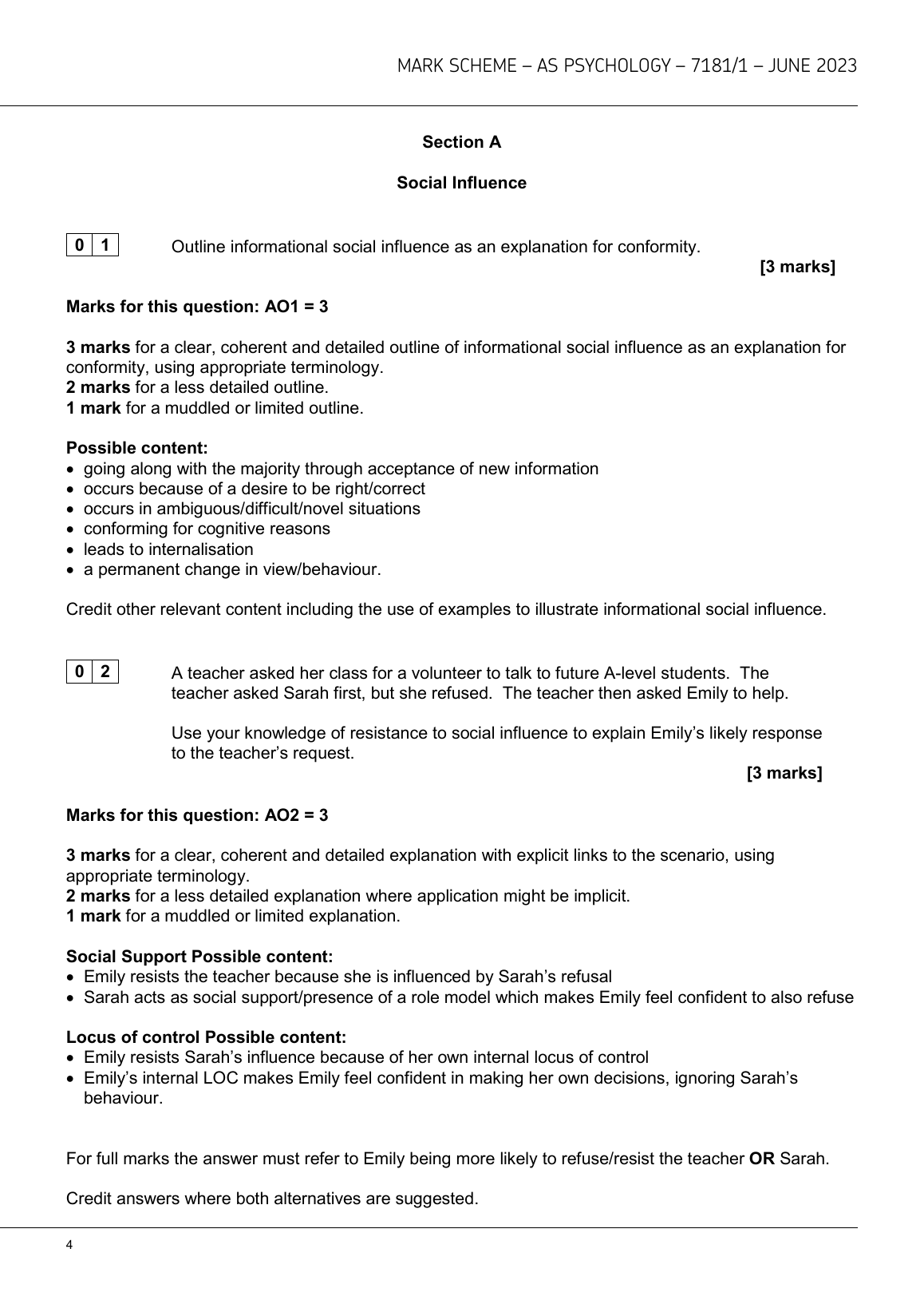 AQA AS PSYCHOLOGY PAPER 1 MARK SCHEME JUNE 2023 (7181/1:Introductory topics in psychology)
