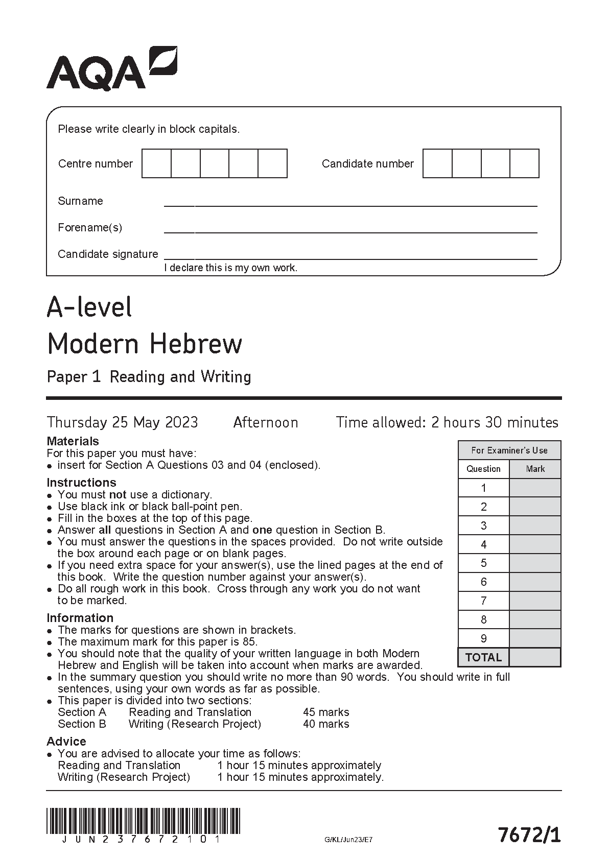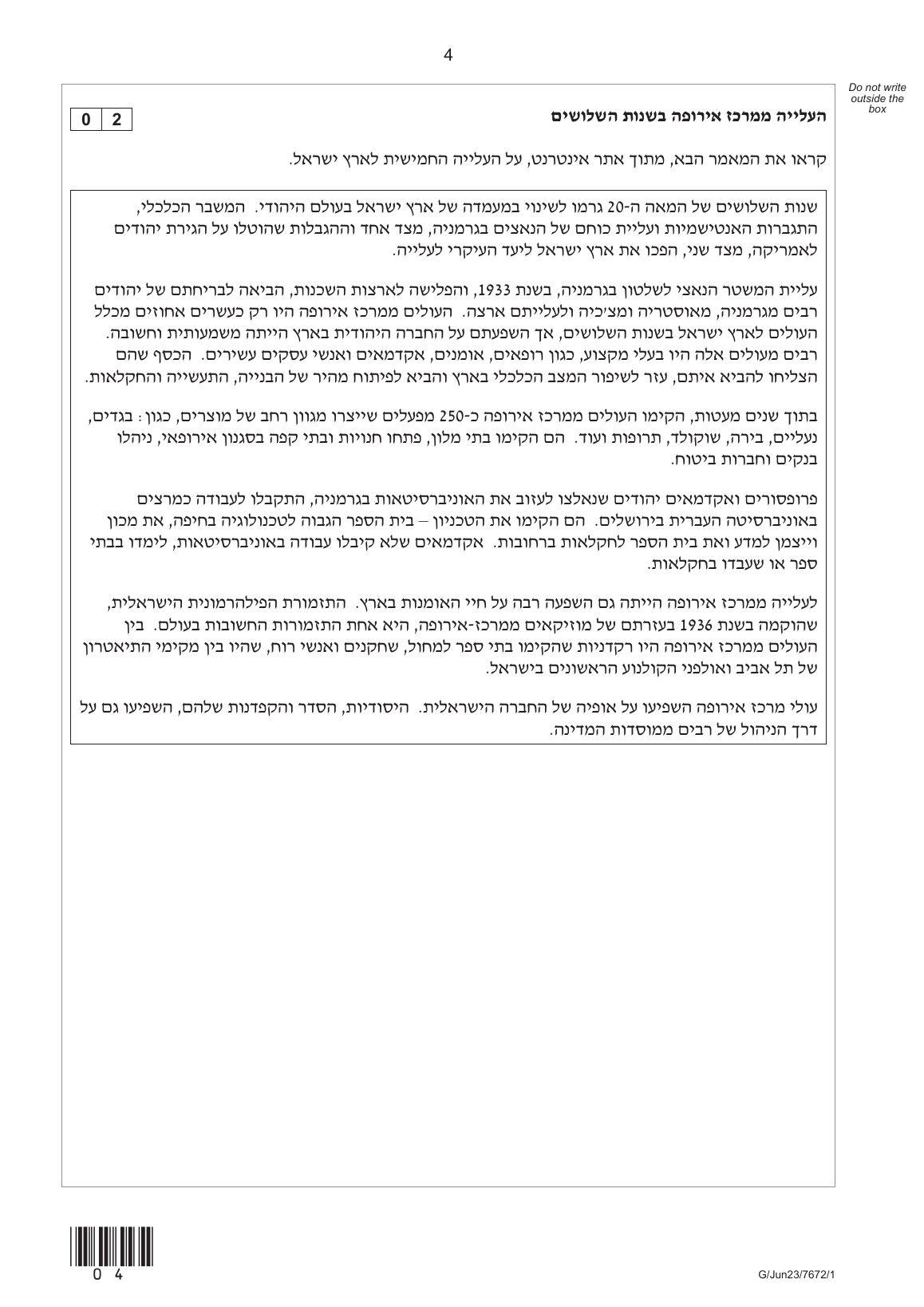 AQA A LEVEL MODERN HEBREW PAPER 1 QUESTION PAPER 2023 (7672/1: Reading and Writing)