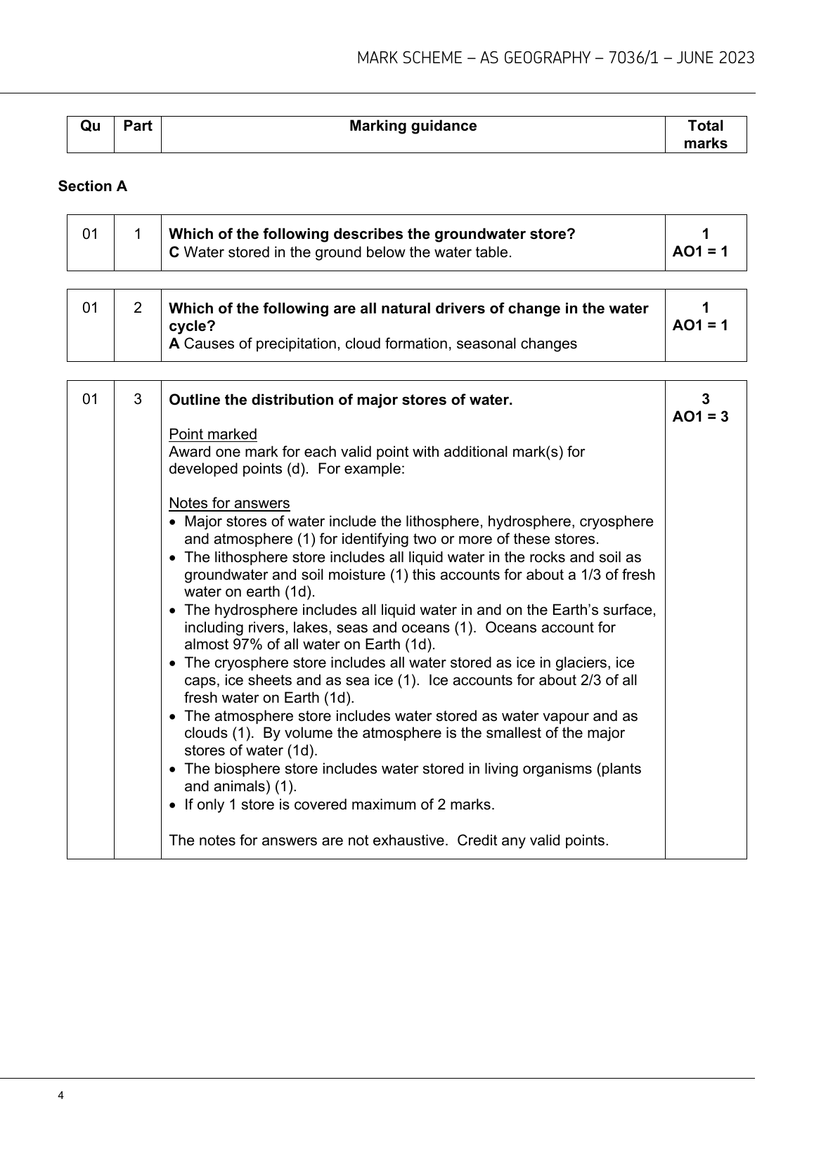 AQA AS GEOGRAPHY MARK SCHEME PAPER 1 JUNE 2023 (7036/1:Physical geography and people and the environment)