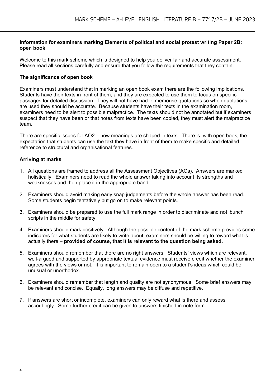AQA A LEVEL ENGLISH LITERATURE B MARKSCHEME PAPER 2B 2023 (7717/2B; Texts and genres: Elements of political and social protest writing)