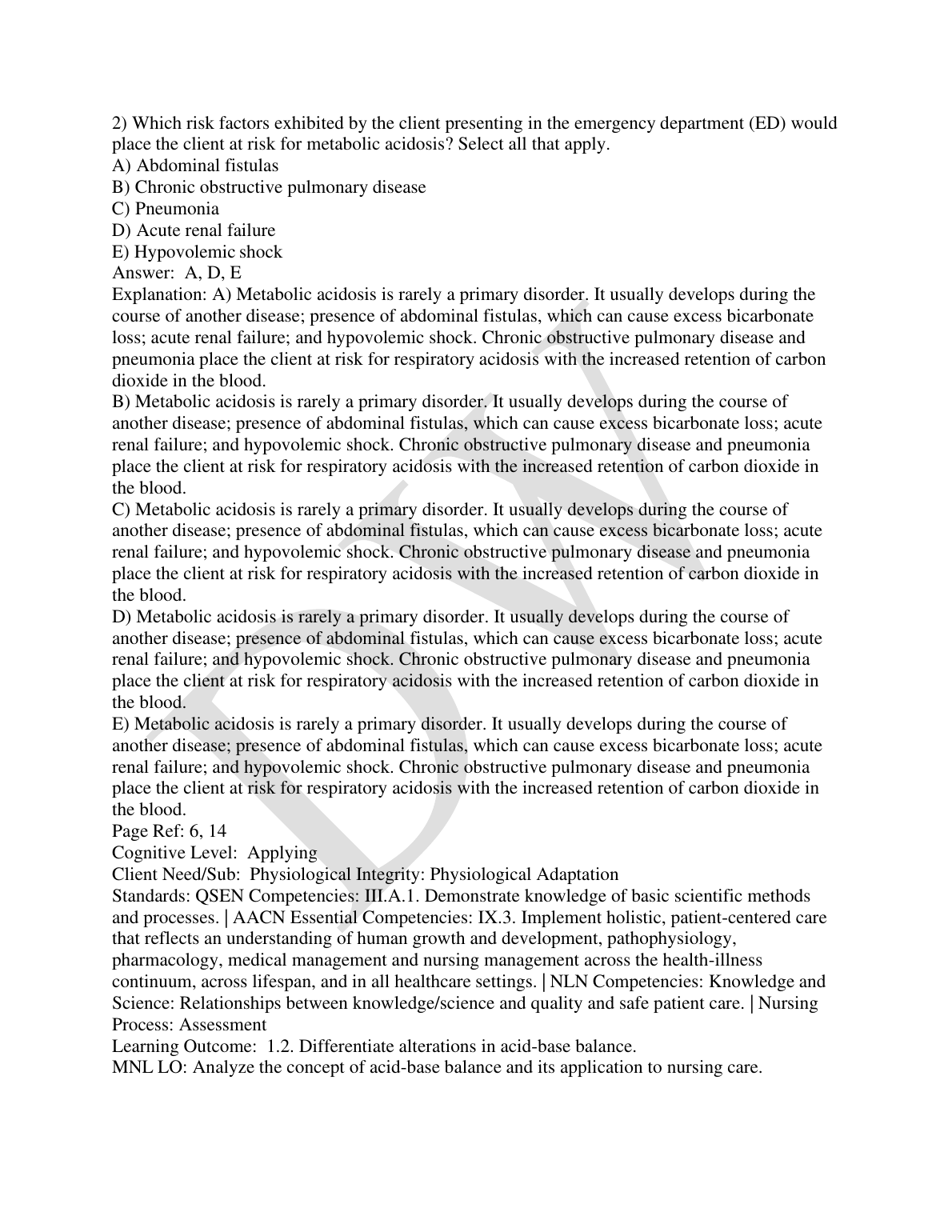 Explanation: A) A client who is fasting is at risk for development of metabolic acidosis. The
