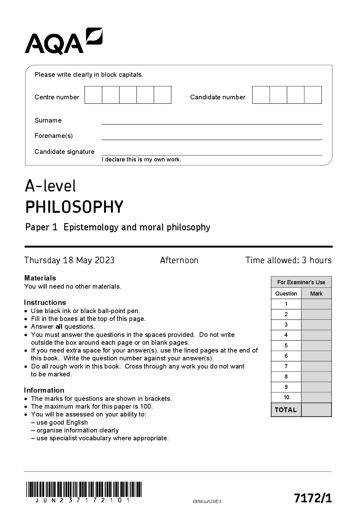 AQA A LEVEL PHILOSOPHY PAPER 1 QUESTION PAPER 2023 (7172/1: Epistemology and moral philosophy). DOWNLOAD OFFICIAL AND VERIFIED AQA A LEVEL PHILOSOPHY PAPER 1 QUESTION PAPER 2023 ON www.leakedexams.com.