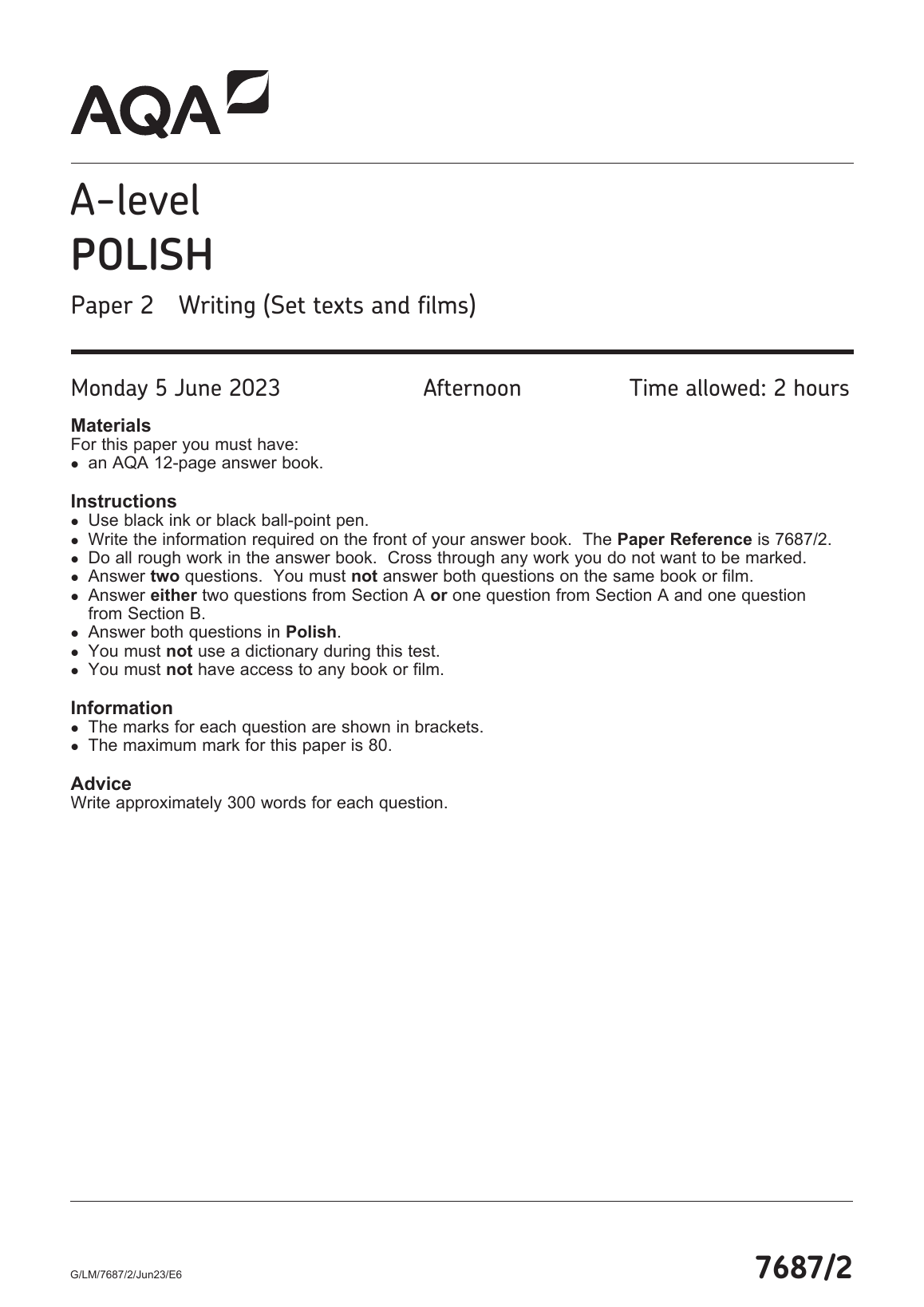 AQA A LEVEL POLISH PAPER 2 QUESTION PAPER 2023 (7687/2: Writing (Set texts and films))