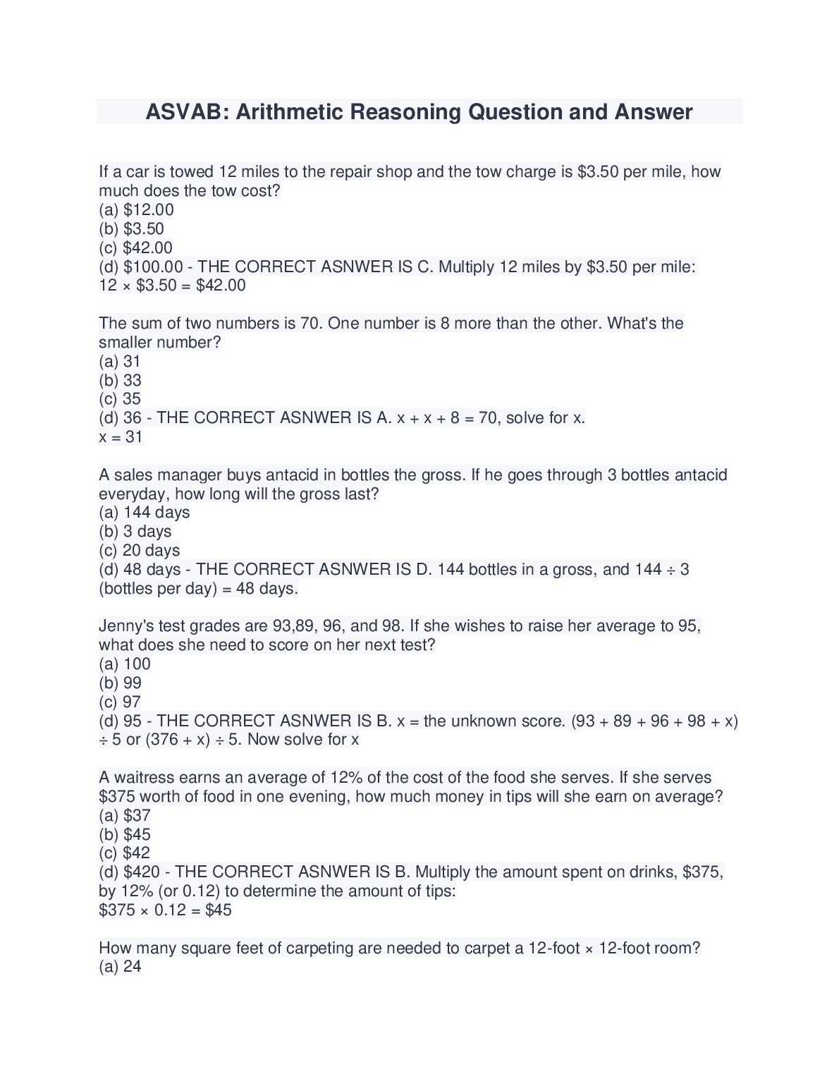 ASVAB: Arithmetic Reasoning Question a...