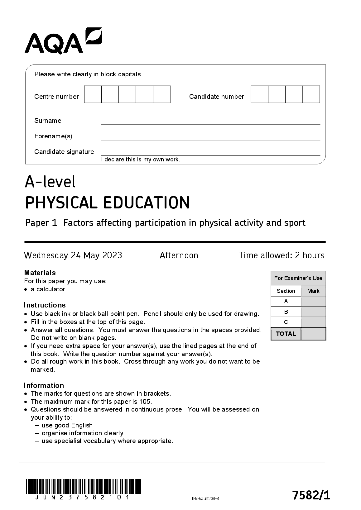 AQA A LEVEL PHYSICAL EDUCATION PAPER 1 QUESTION PAPER 2023 (7582/1: Factors affecting participation in physical activity and sport). DOWNLOAD OFFICIAL AND VERIFIED AQA A LEVEL PHYSICAL EDUCATION PAPER 1 QUESTION PAPER 2023 ON www.leakedexams.com.