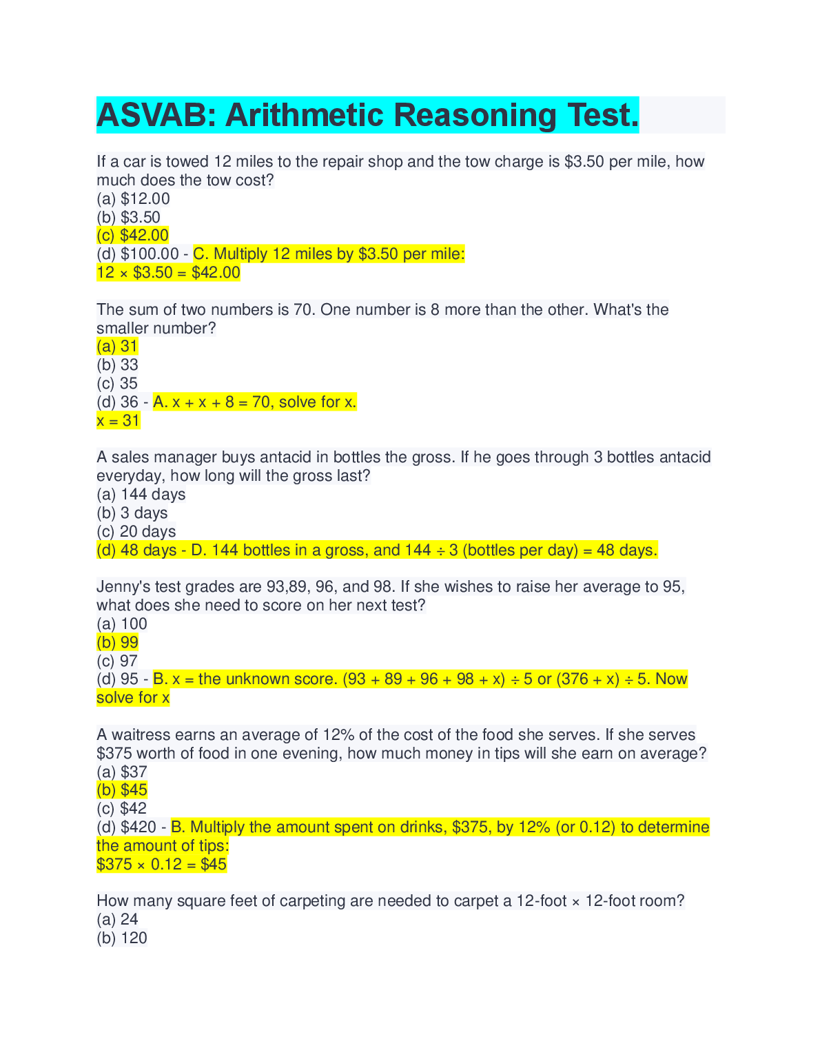 ASVAB :ARITHMETIC REASONING LATEST UPDATED TEST QUESTIONS AND ANSWERS 2024