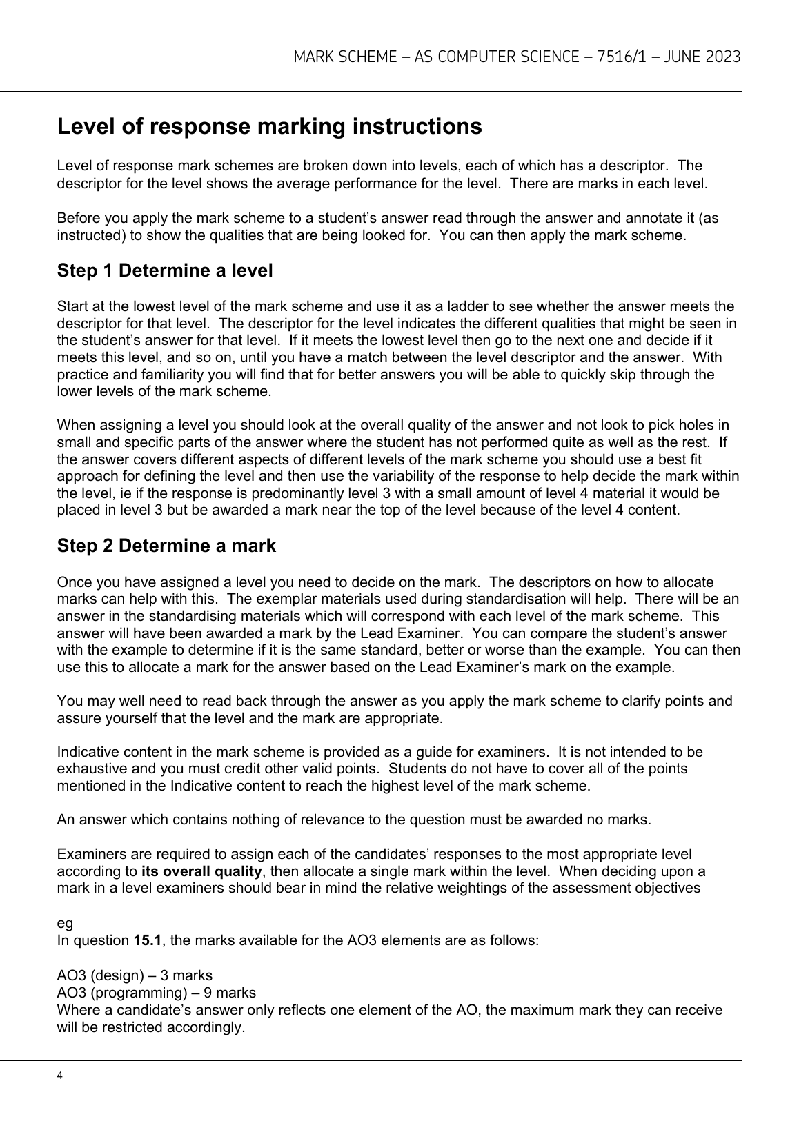 AQA AS COMPUTER SCIENCE PAPER 1 MARK SCHEME 2023 (7516/1)
