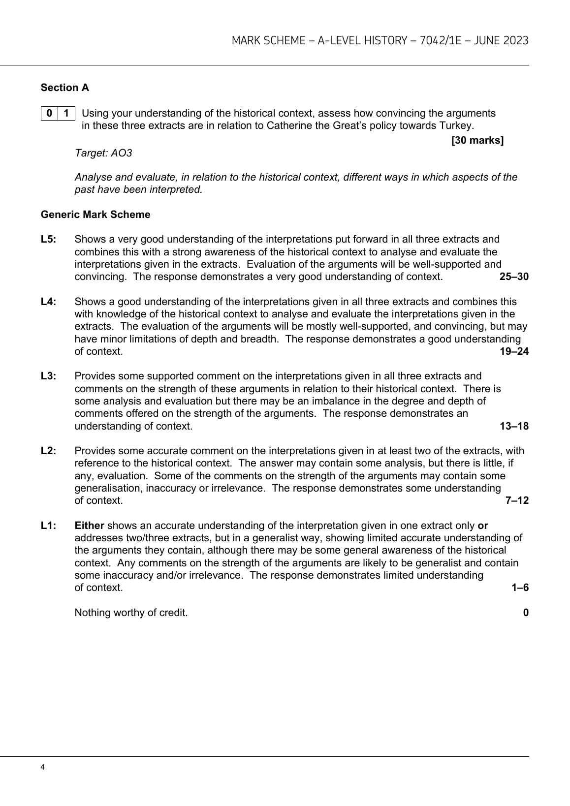 AQA A LEVEL HISTORY PAPER 1 MARK SCHEME (7042/1E: Component 1E Russia in the Age of Absolutism and Enlightenment, 1682–1796) Â