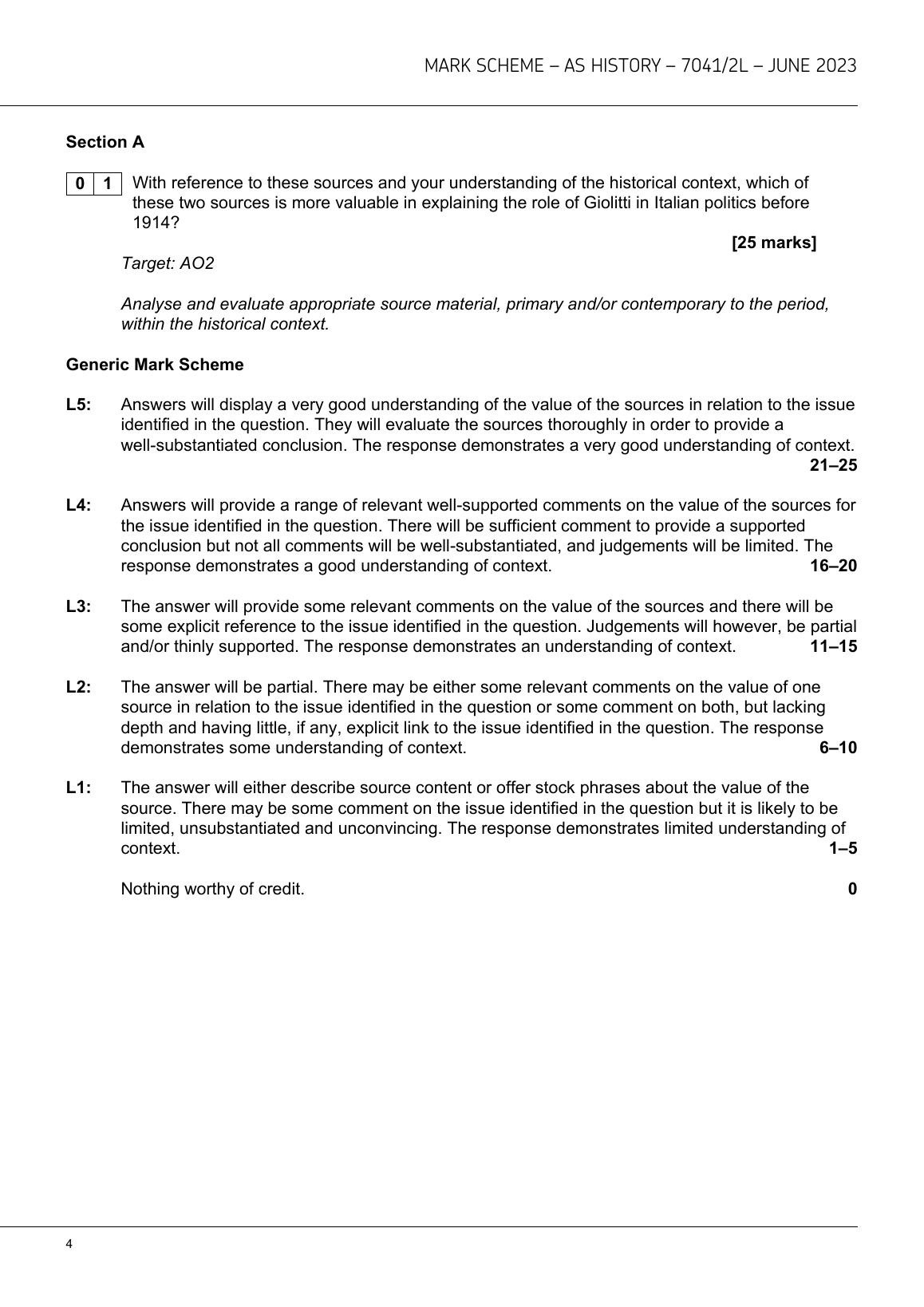 AQA AS HISTORY PAPER 2L MARK SCHEME 2023(Italy and Fascism, c1900–1945