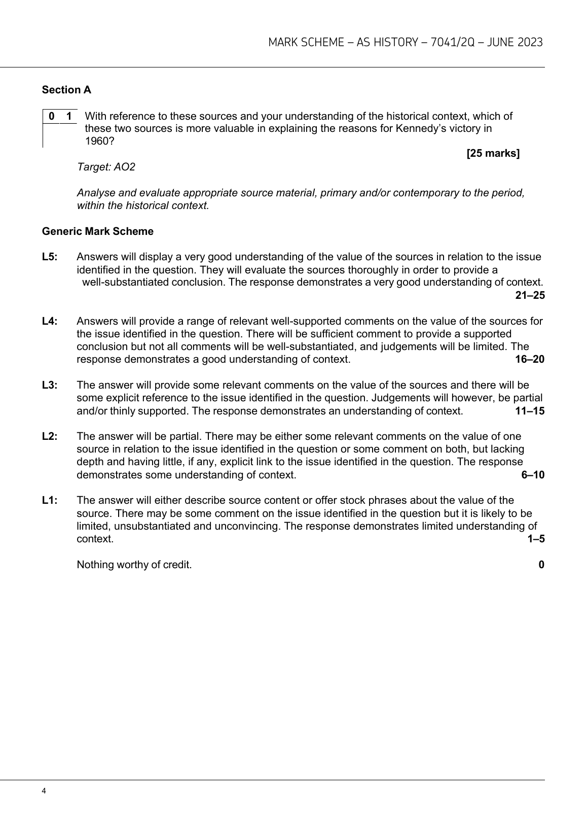AQA AS HISTORY PAPER 2Q MARK SCHEME 2023(The American Dream: reality and illusion, 1945–1980 Component 2Q Prosperity, inequality and Superpower status, 1945–1963:7041/2Q)
