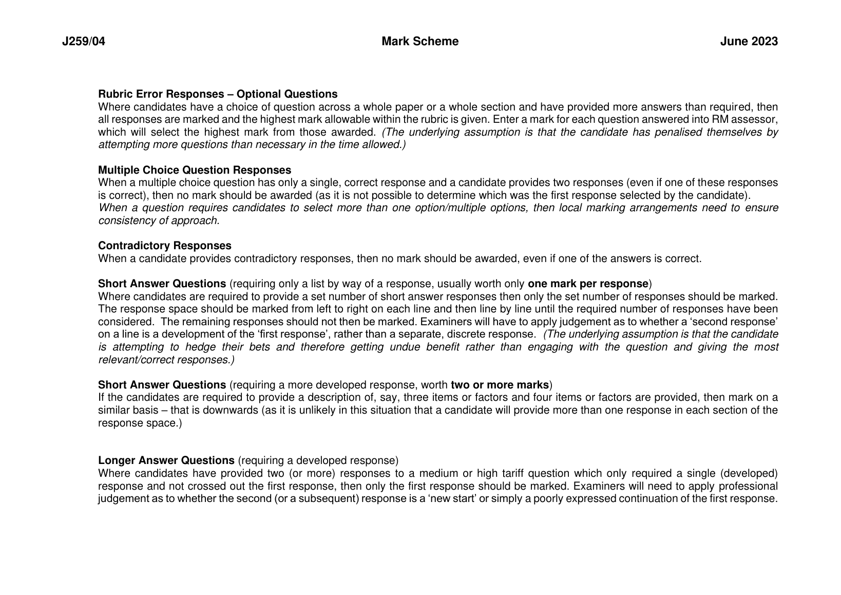 0CR GCSE PHYSICS B MARK SCHEME PAPER 4 2023 (J259/04: Depth in physics)