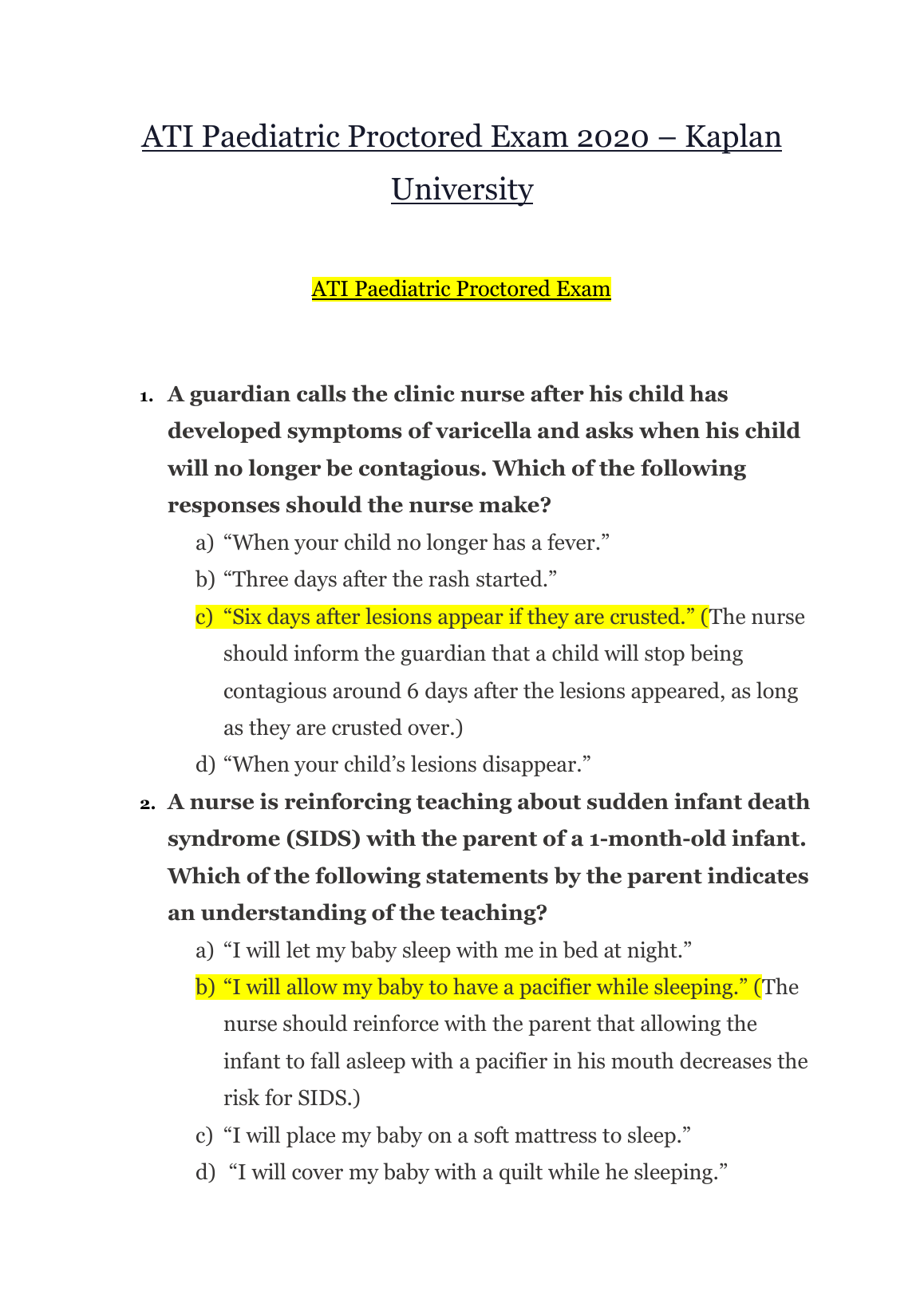 ATI PAEDIATRIC PROCTORED EXAM 2023 (KAPLAN UNIVERSITY)Â