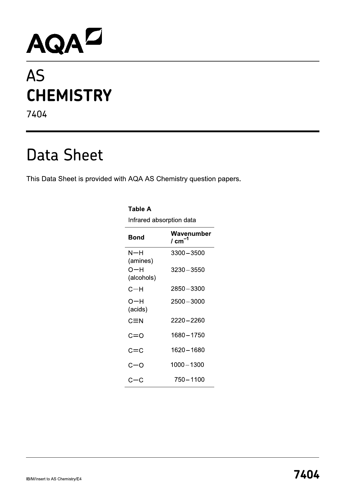 AQA AS CHEMISTRY 7404   2023  INSERT (Data Sheet)