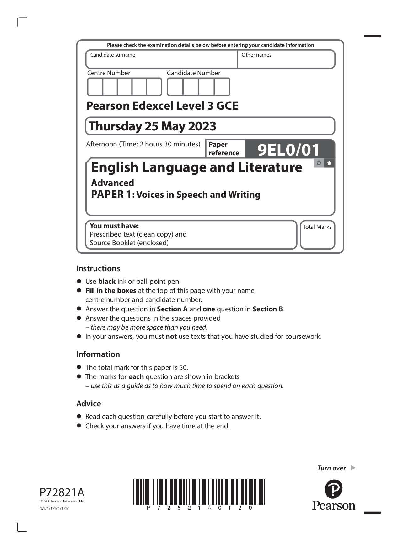 PEARSON EDEXCEL A LEVEL ENGLISH LANGUAGE AND LITERATURE QUESTION PAPER 1 2023 (9EL0/01:Voices in Speech and Writing)