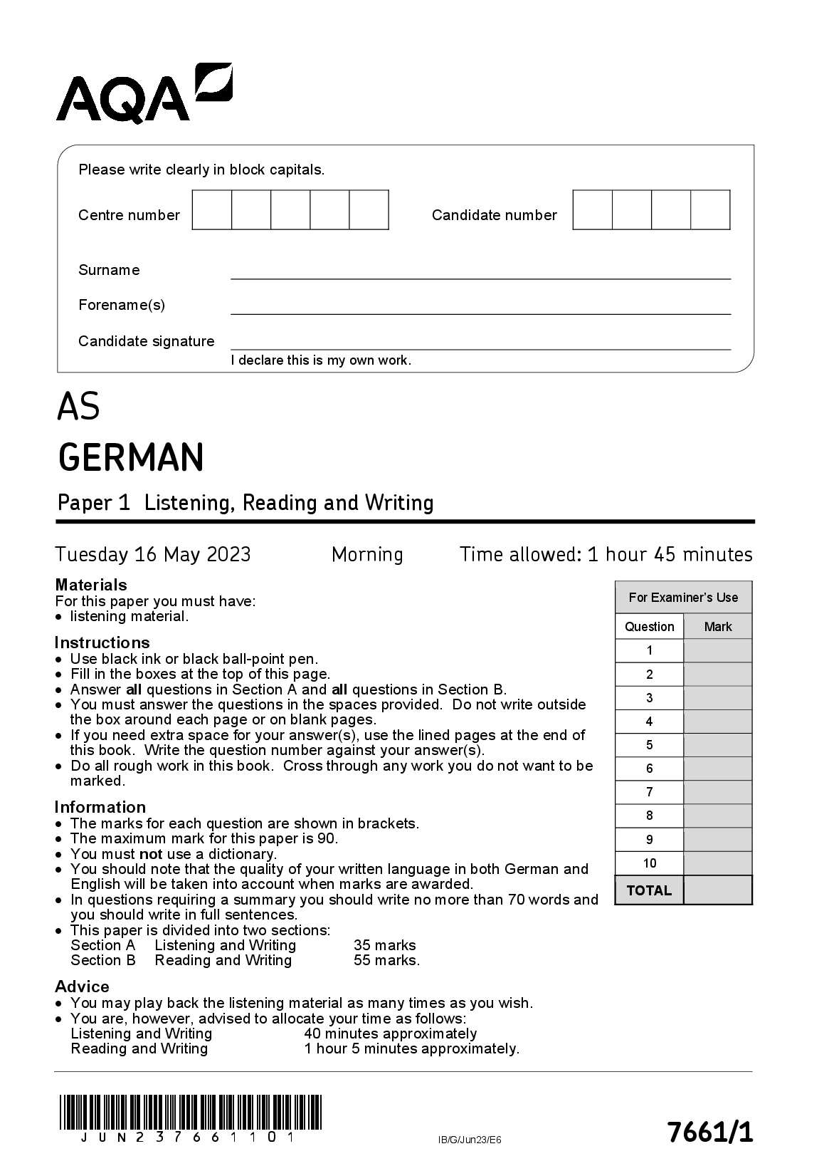 AQA AS GERMAN QUESTION PAPER 1 2023 (7661-1:Listening, Reading and Writing)Â