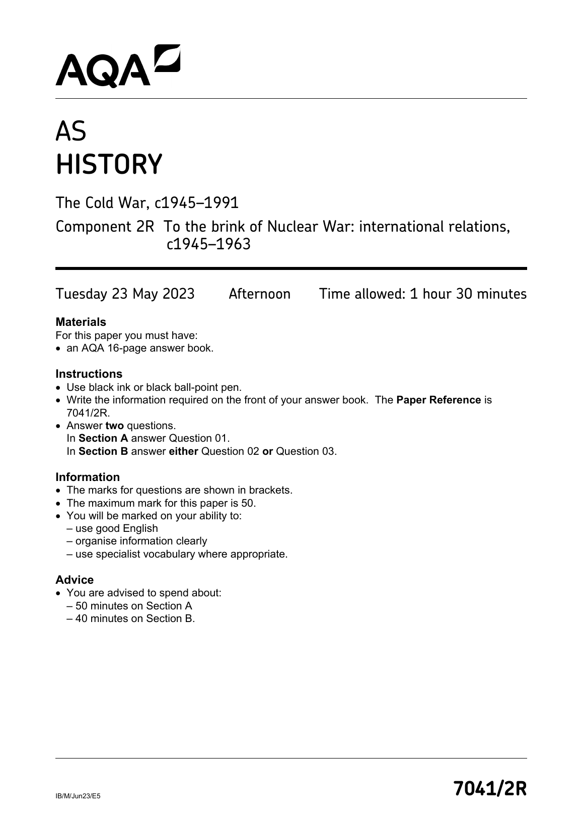 AQA AS LEVEL HISTORY PAPER 2 QUESTION PAPER 2023 (7041/2R: The Cold War, c1945â1991: To the brink of Nuclear War: international relations, c1945â1963). DOWNLOAD OFFICIAL AND VERIFIED AQA AS LEVEL HISTORY PAPER 2 QUESTION PAPER 2023 ON www.leakedexams.com.