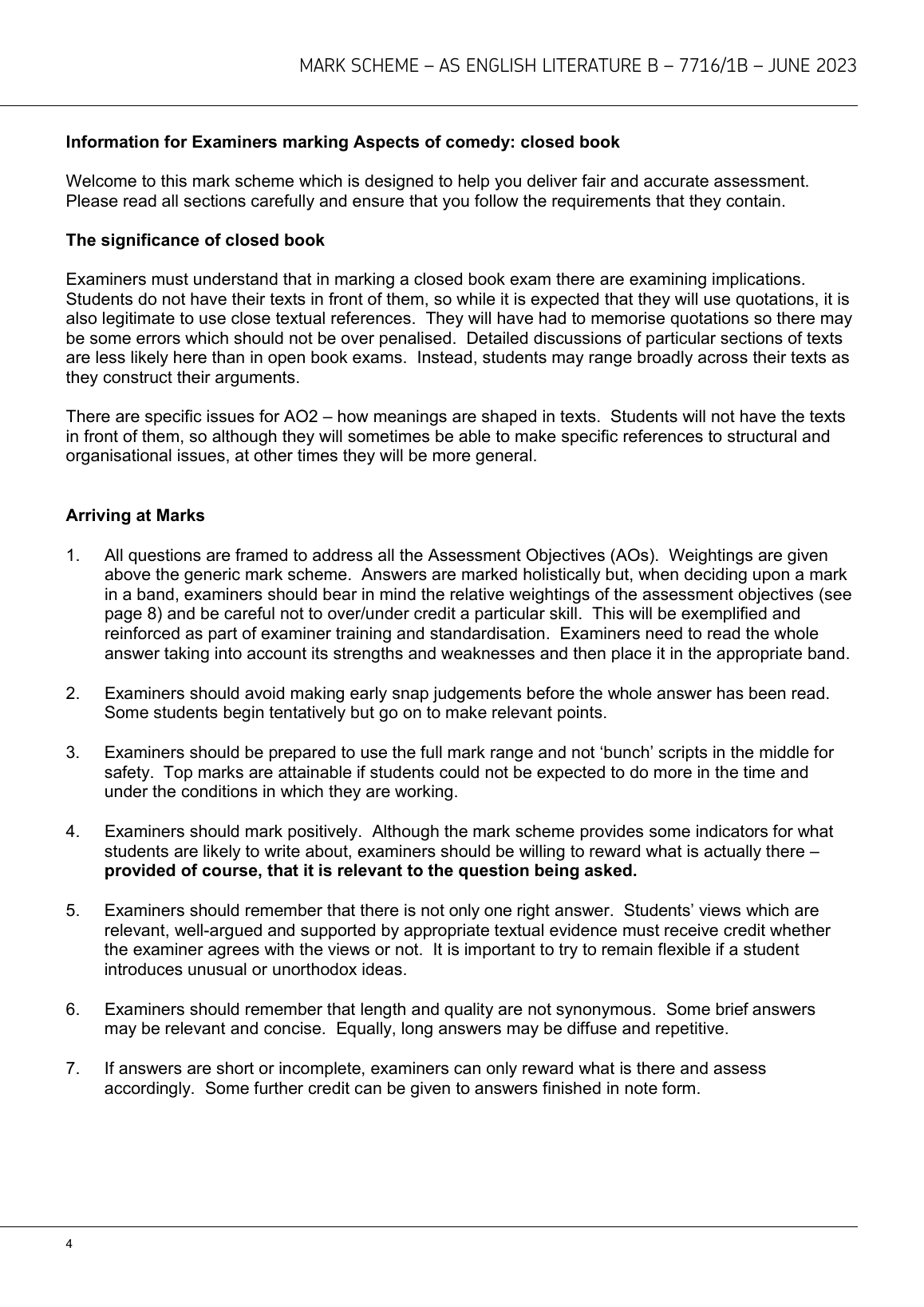 2023 AQA As ENGLISH LITERATURE B MARK SCHEME PAPER 1B [7716/1B: Literary genres:Drama: Aspects of comedy]Â Â