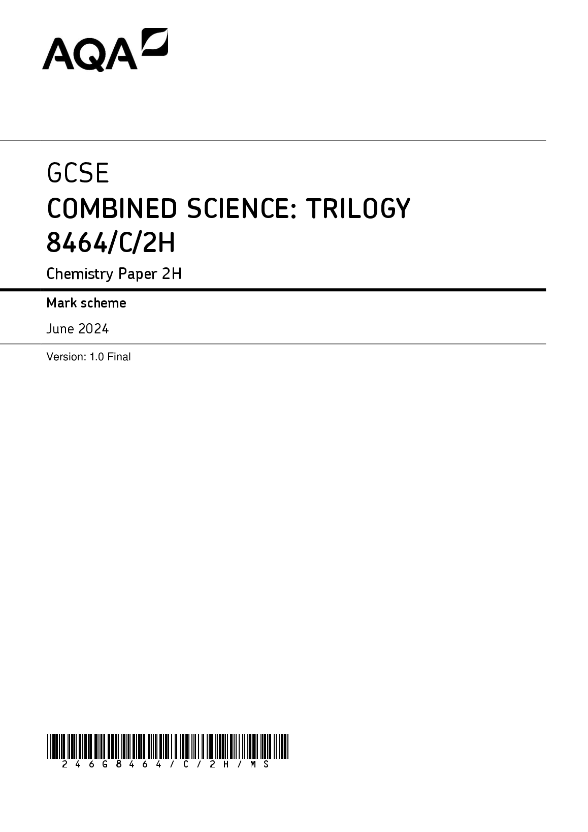 AQA GCSE CHEMISTRY COMBINED SCIENCE: TRILOGY PAPER 2 MARK SCHEME 2024 (8464/C/2H: Higher Tier)
