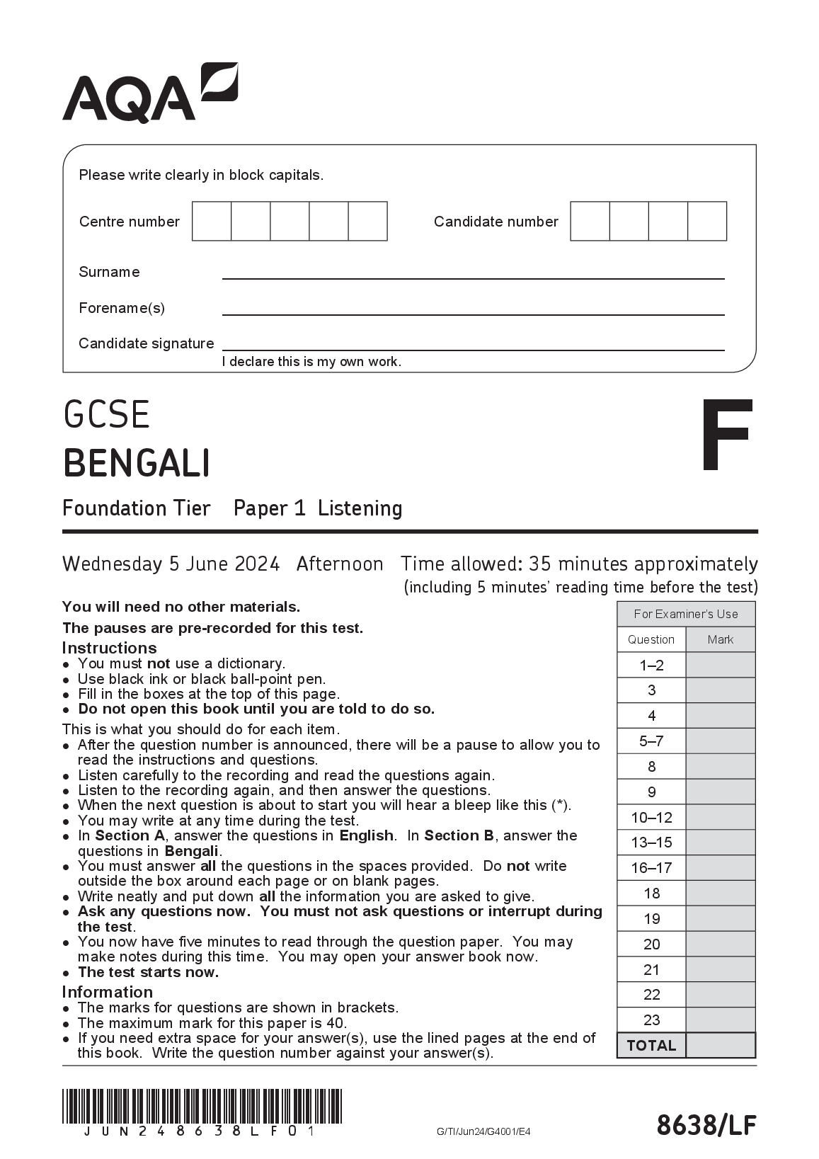 2024 AQA GCSE BENGALI Paper 1 Listening QP(8638/LF:Foundation Tier)