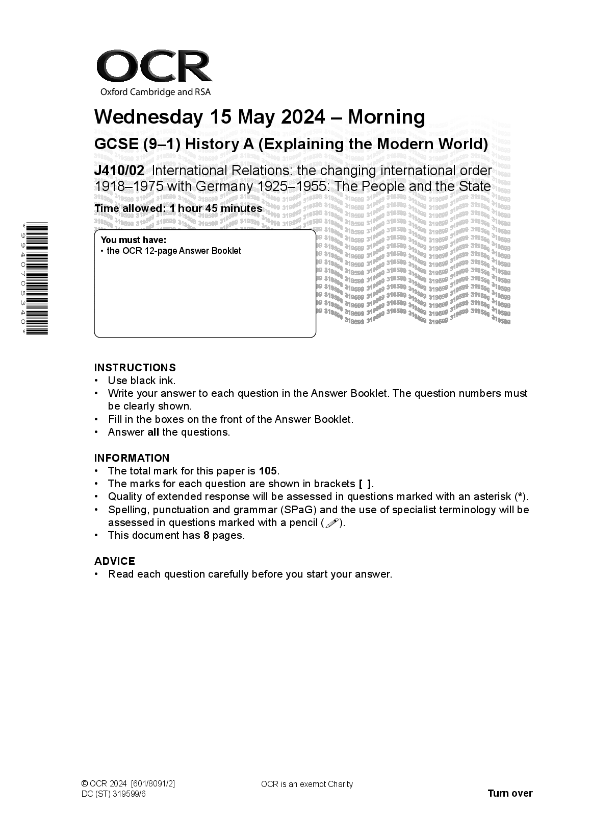 2024 OCR GCSE History A Paper 2 (J410/02 :International Relations: the changing international order 1918–1975 with Germany 1925–1955: The People and the State)