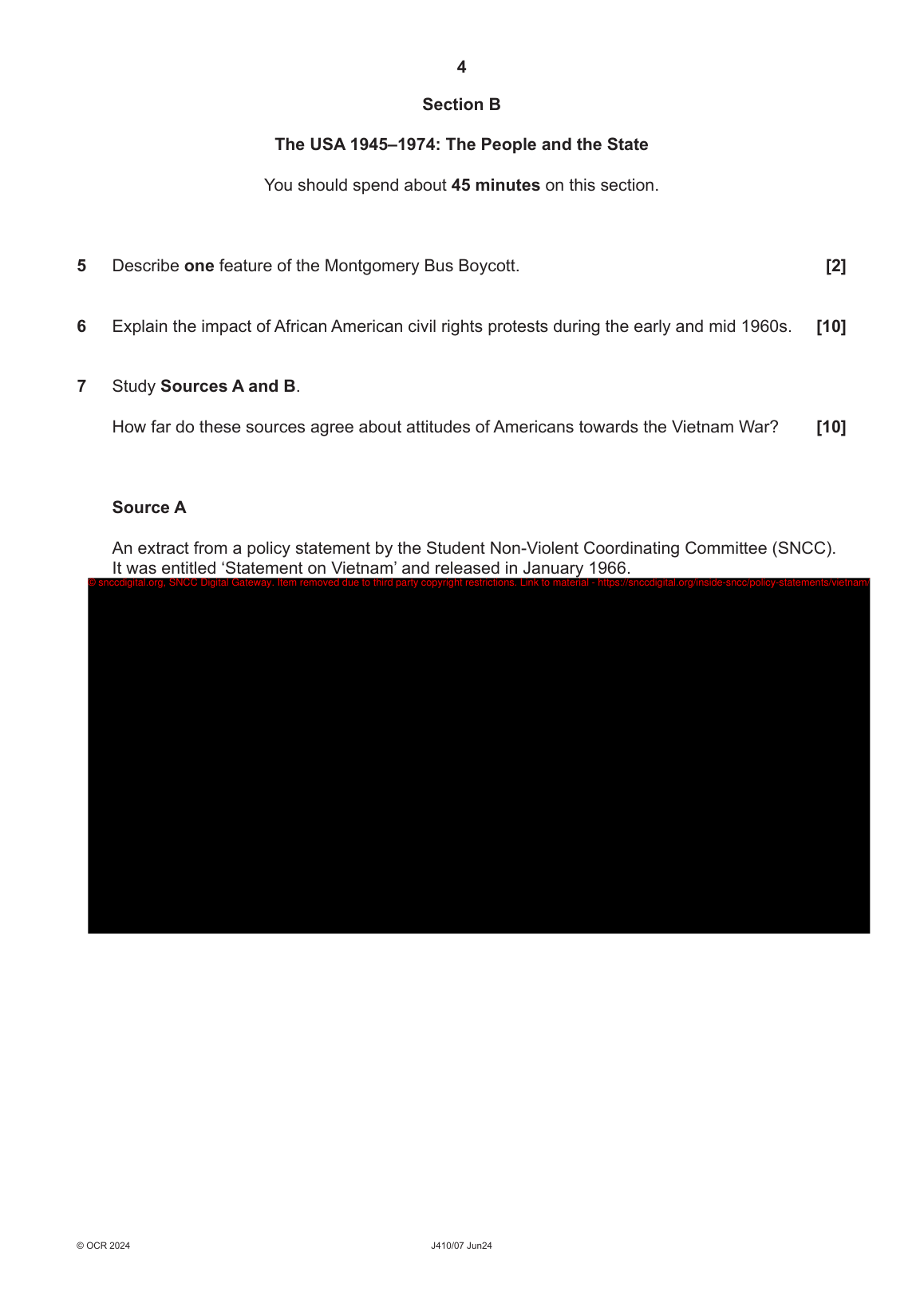 2024 OCR GCSE History A Paper 7 (J410/07: International Relations: the changing international order 1918–1975 with The USA 1945–1974: The People and the State)