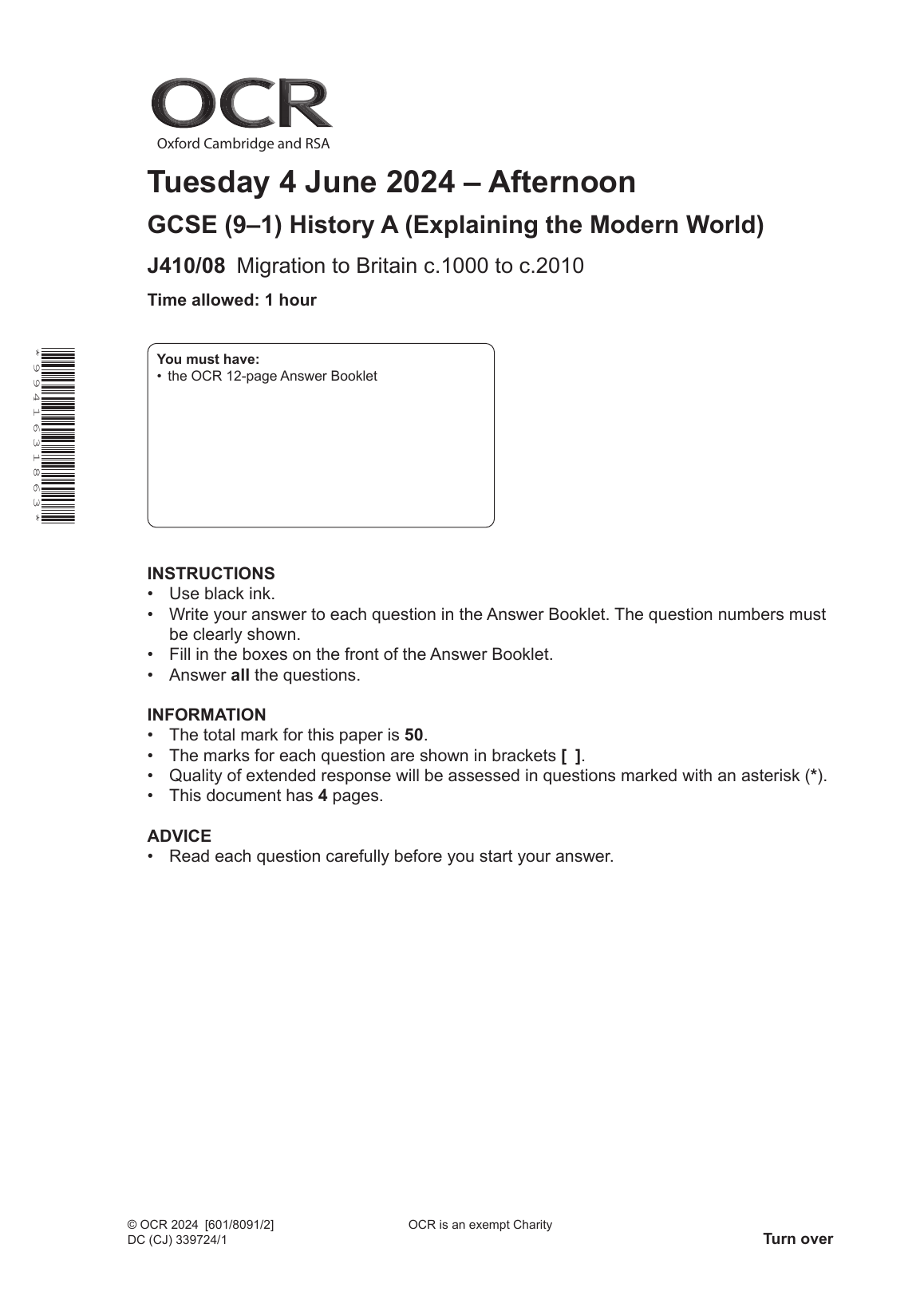 2024 OCR GCSE History A Paper 8 (J410/08 Migration to Britain c.1000 to c.2010)