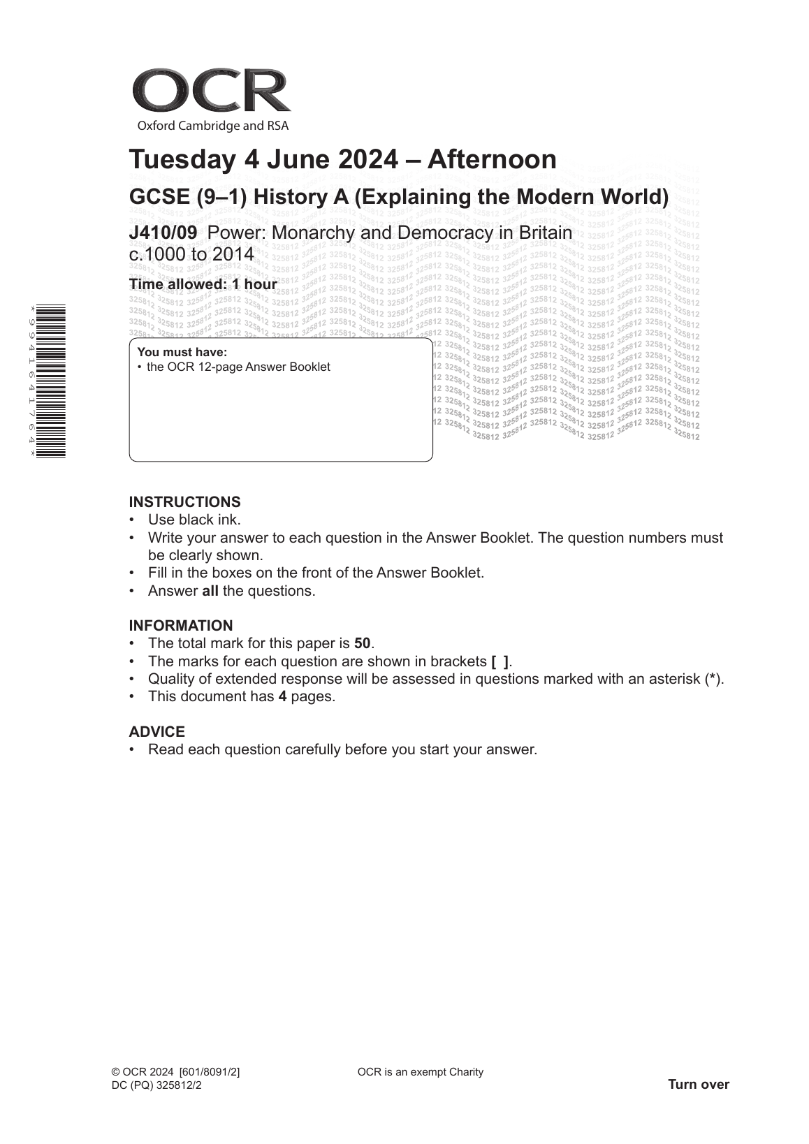 2024 OCR GCSE History A Paper 9 (J410/09 Power: Monarchy and Democracy in Britain c.1000 to 2014)