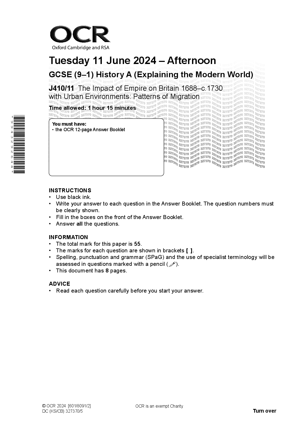 2024 OCR GCSE History A Paper 11 (J410/11: The Impact of Empire on Britain 1688–c.1730 with Urban Environments: Patterns of Migration)
