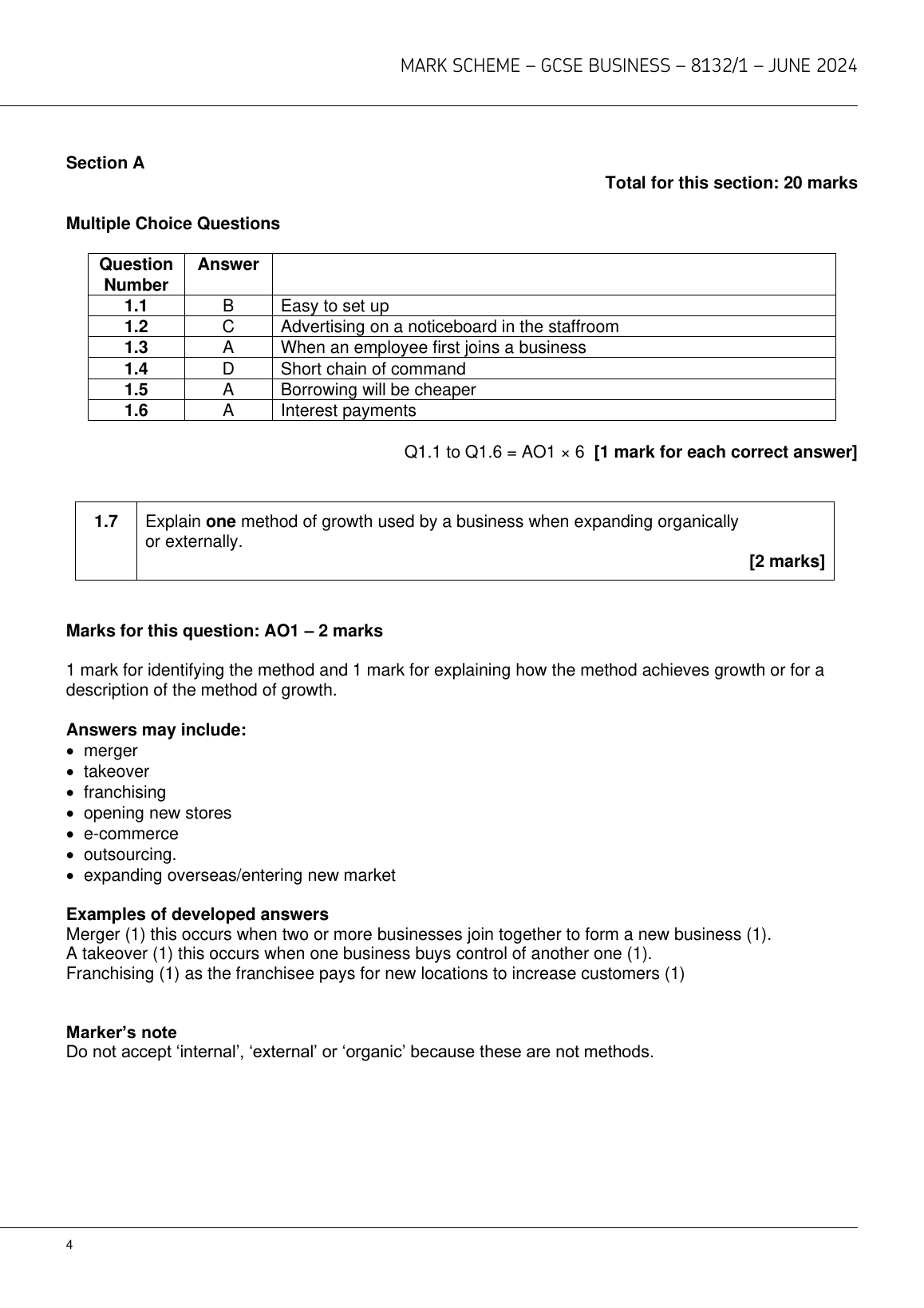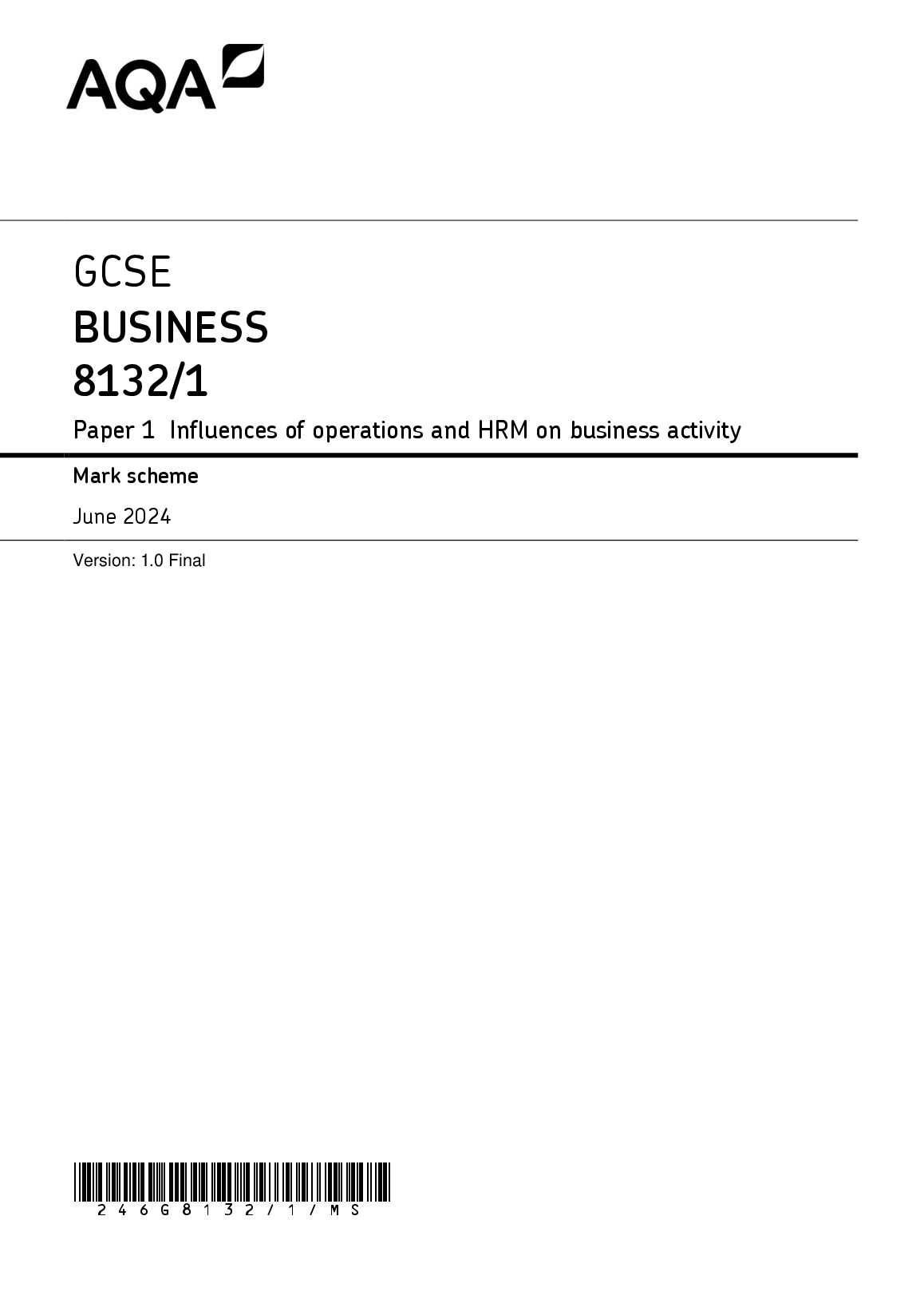 2024 AQA GCSE BUSINESS PAPER 1 MARK SCHEME (8132/1: Influences of operations and HRM on business activity)