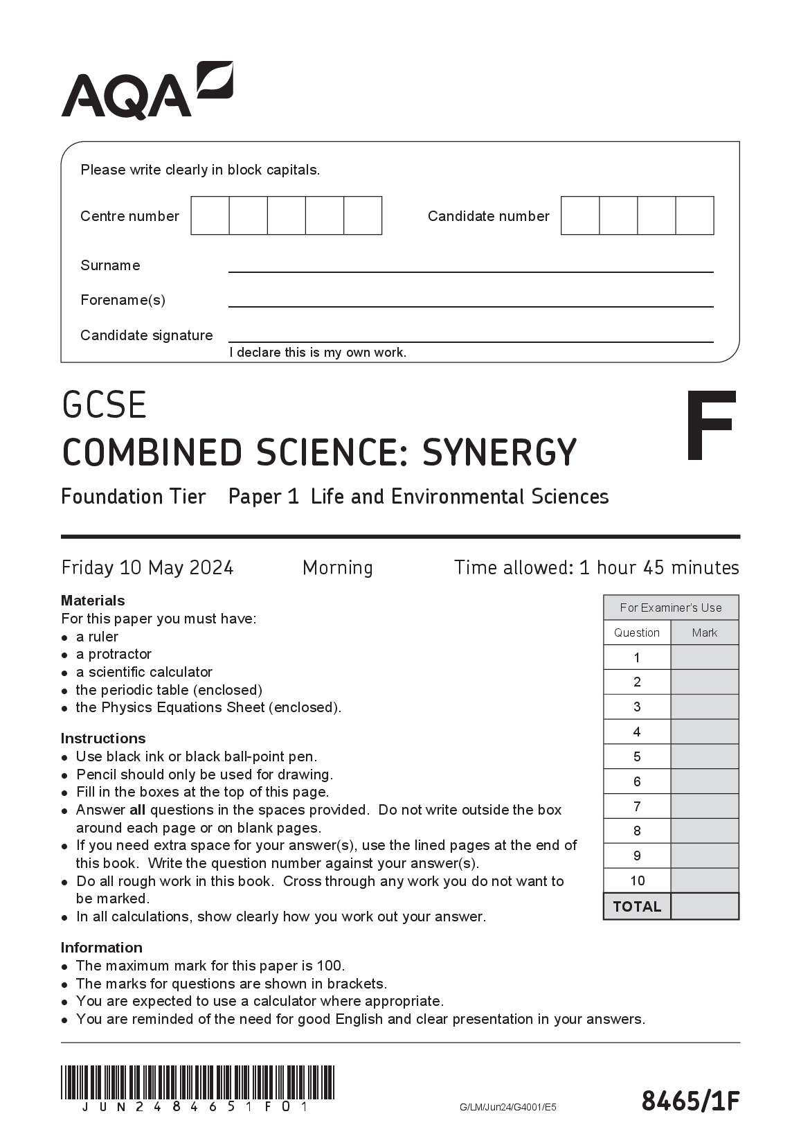 2024 AQA GCSE COMBINED SCIENCE PAPER 1 QP(8465/1F:FOUNDATION TIER)